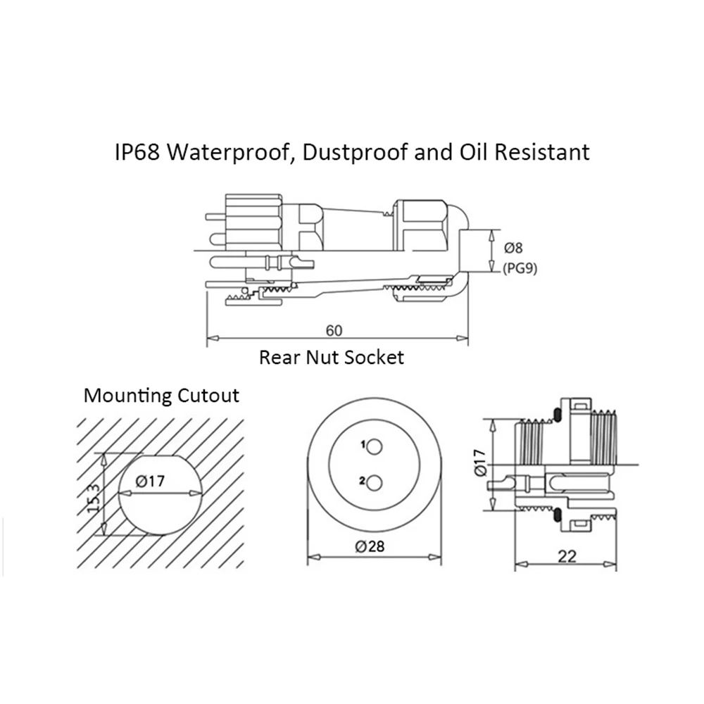 SP17-это средний размер серии SP. Он больше SP13 и может работать при более высоком напряжении. Это пластик с резьбовым соединением и водонепроницаемым разъемом IP68. С различными контактами от 2-9 SP17 обогатить IP68 Водонепроницаемый SP семьи с среднего панельного отверстия вырезать Размер 17 мм и максимальная толщина панели 4 мм.