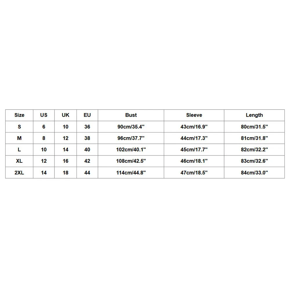 Размеры Свяжитесь с нами Великобритания ЕС Обхват груди Рукава Длина S 6 10 36 90 см/35,4" 43 см для ухода за ребенком для мам/16,9" 80 см/31,5" М 8 12 38 96 см/37,7" 44 см/17,3" 81 см/31,8" L 10 14 40 102 см/40,1" 45 см/17,7" 82 см/32,2" XL 12 16 42 108 см/42,5" 46 см/18,1" 83 см/32,6" 2XL 14 18 44 114 см/44,8" 47 см/18,5" 84 см/33,0"