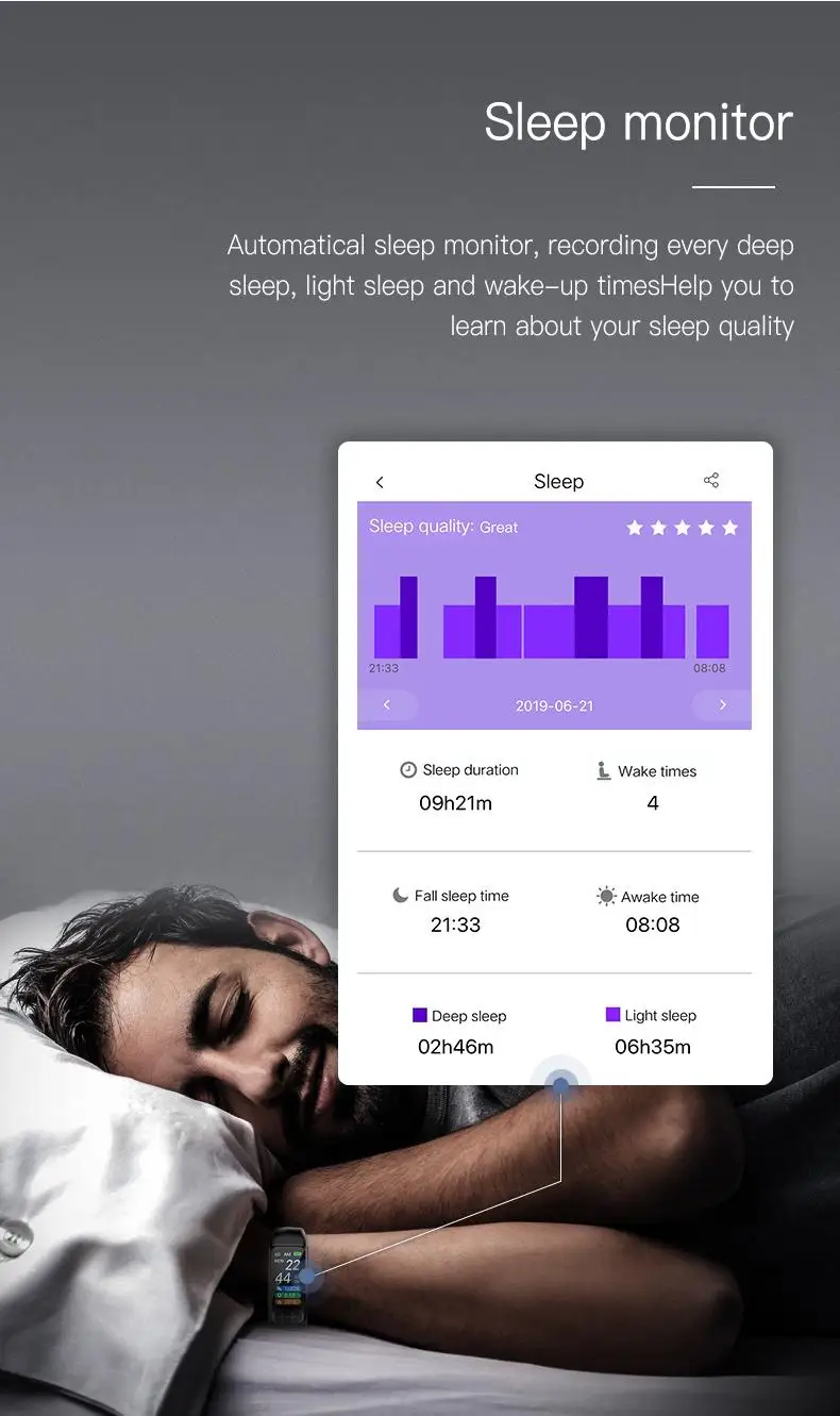 ● Во время сна, браслет будет автоматически контролировать, как долго и как хорошо вы спите. Пожалуйста, установите время сна из «личной информации». (Пожалуйста, носите браслет, когда вы спите, чтобы записывать данные о вашем сне)