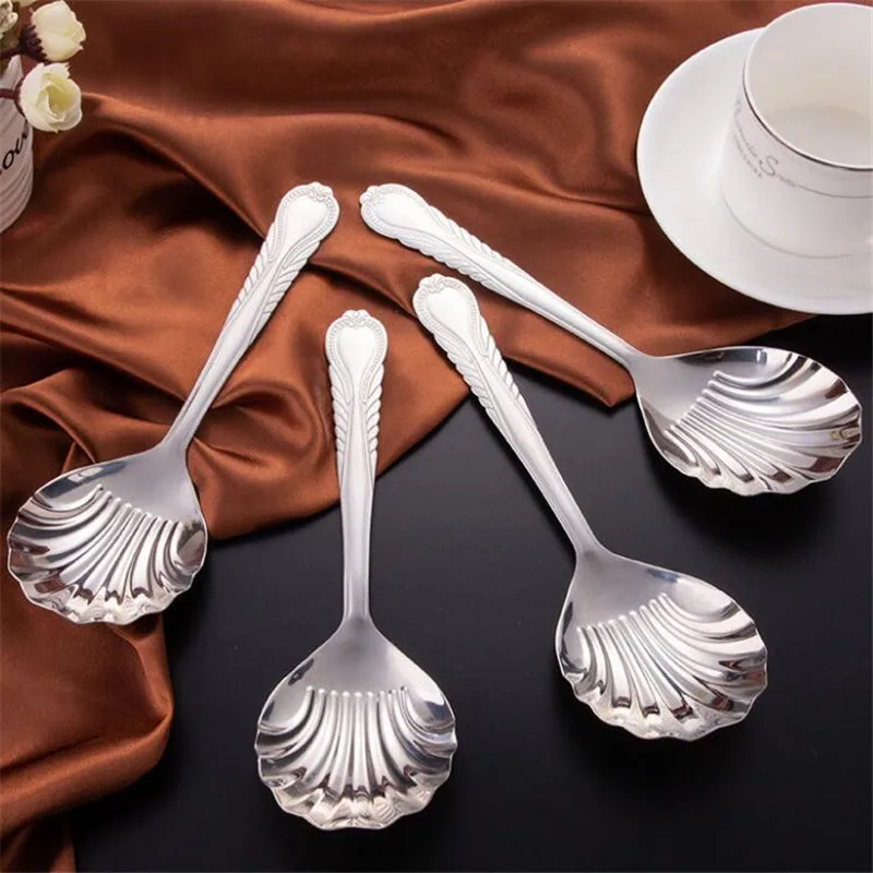 Сахарная ложка в форме раковины из нержавеющей стали, ложки для мороженого, кофе, чая, десерта, торта, ложка для чая, серебряные столовые приборы