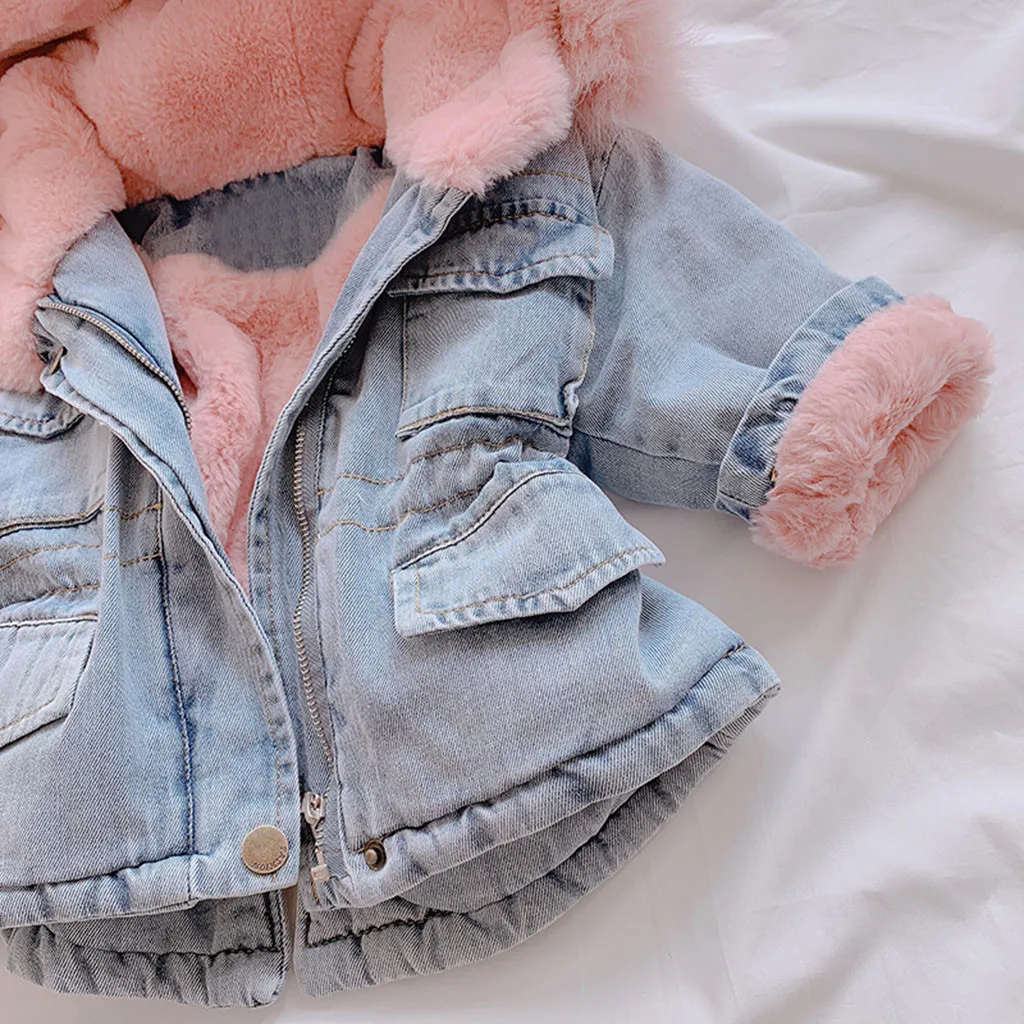Теплое плотное джинсовое пальто из искусственного меха с капюшоном для маленьких девочек, верхняя одежда