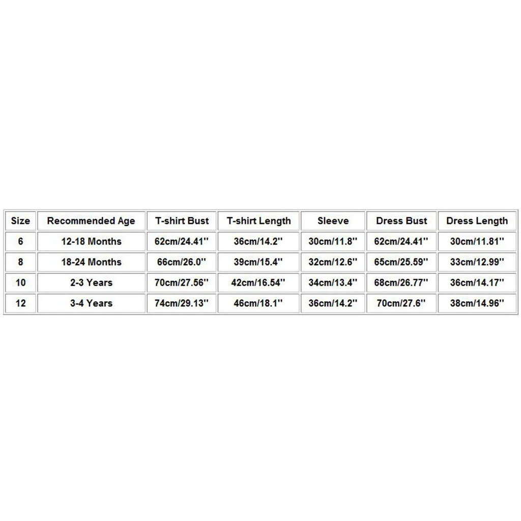 Размер Рекомендуемый возраст Обхват груди для футболки; Футболка Длина Рукава Обхват груди у платья Платье Длина 6 12-18 месяцев 62 см/24,41'' 36 см/14,2'' 30 см/11,8'' 62 см/24,41'' 30 см/11,81'' 8 18-24 месяцев 66 см/26,0'' 39 см/15,4'' 32 см/12,6'' 65 см/25,59'' 33 см/12,99'' 10 От 2 до 3 лет 70 см/27,56'' 42 см/16,54'' 34 см/13,4'' 68 см/26,77'' 36 см/14,17'' 12 От 3 до 4 лет 74 см/29,13'' 46 см/18,1'' 36 см/14,2'' 70 см/27,6'' 38 см/14,96''