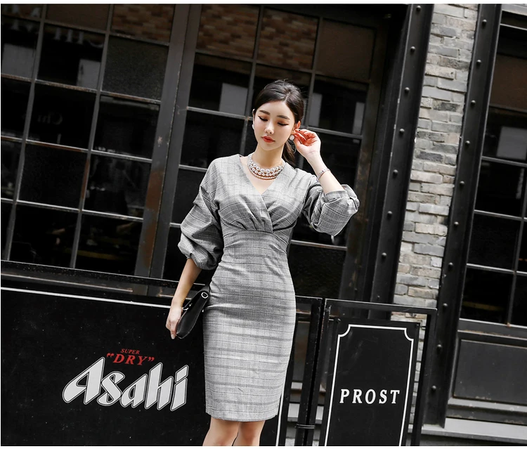 Серое платье в клетку с рукавами-фонариками и перекрестным v-образным вырезом, Женская Весенняя официальная одежда, облегающее платье-карандаш с открытой спиной DV68