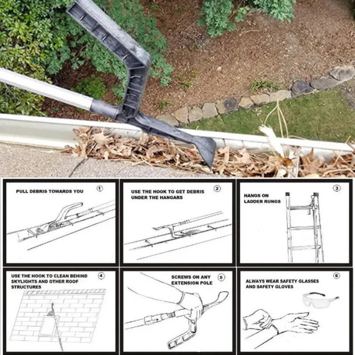 Уникальный крючок в форме, чтобы вытянуть мусор под желоба вешалки и очистить позади световых люков и других конструкций крыши.