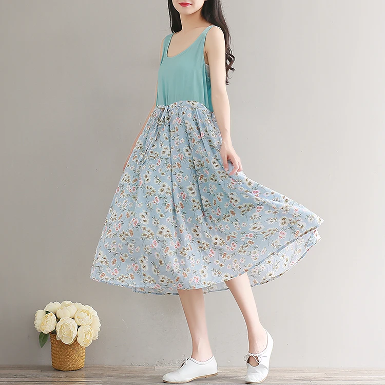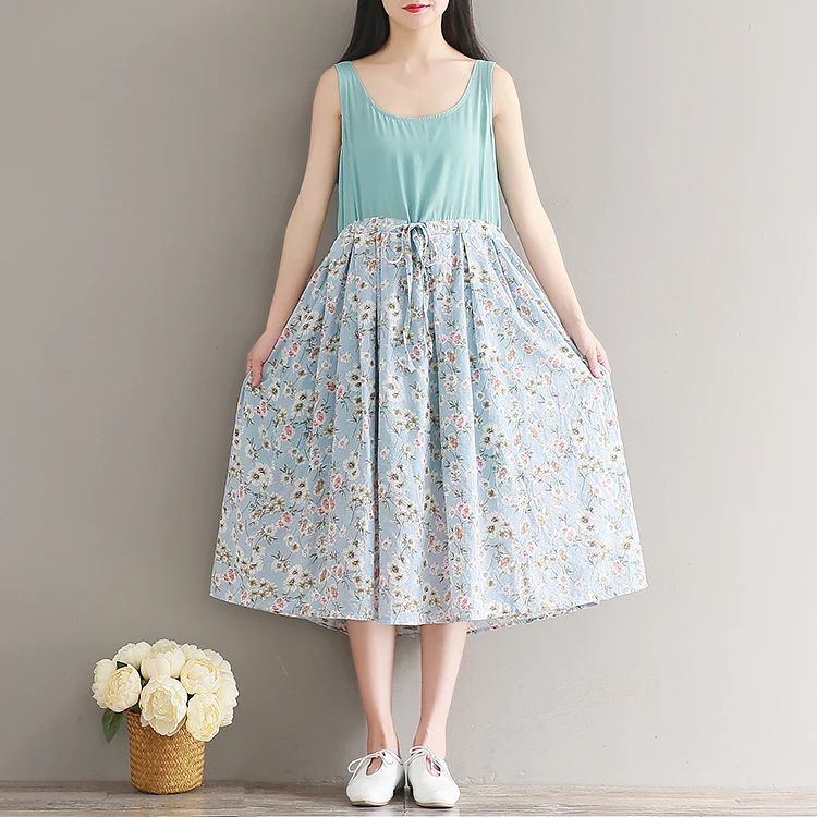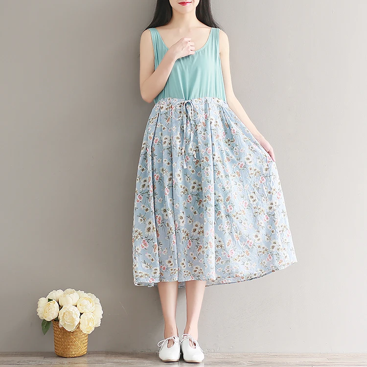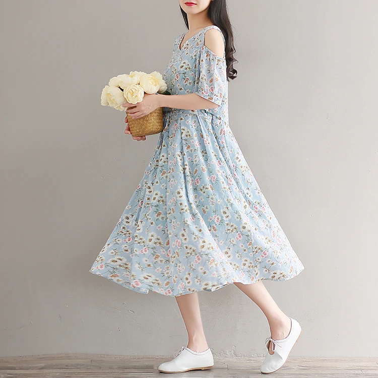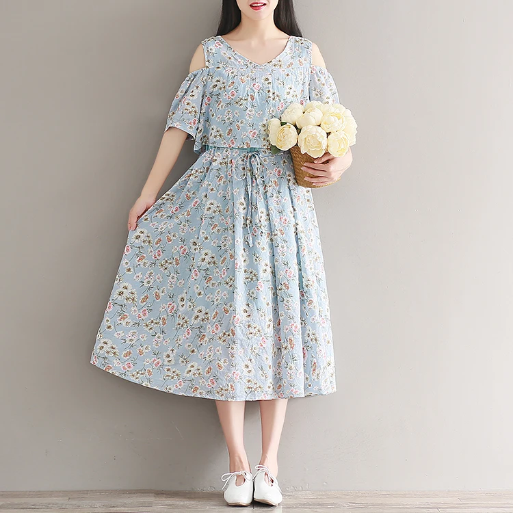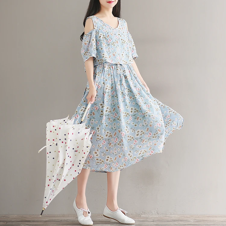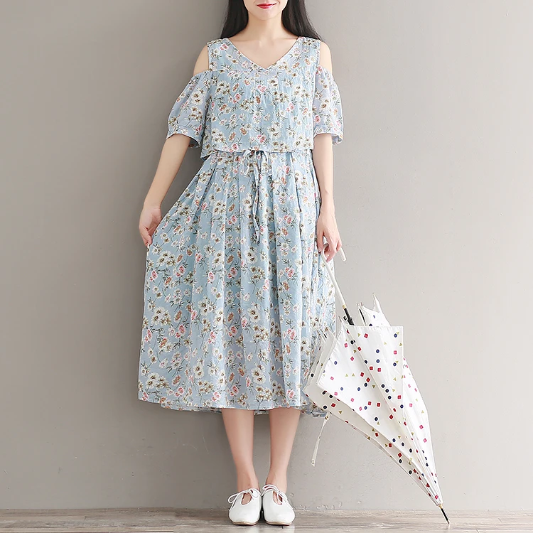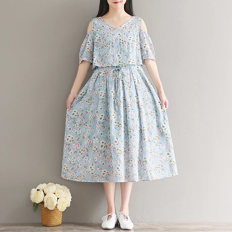 Женское летнее платье, винтажное платье с цветочным принтом, с открытыми плечами, с высокой талией, со шнуровкой, плиссированное, из двух частей, хлопковое, льняное платье, DV909