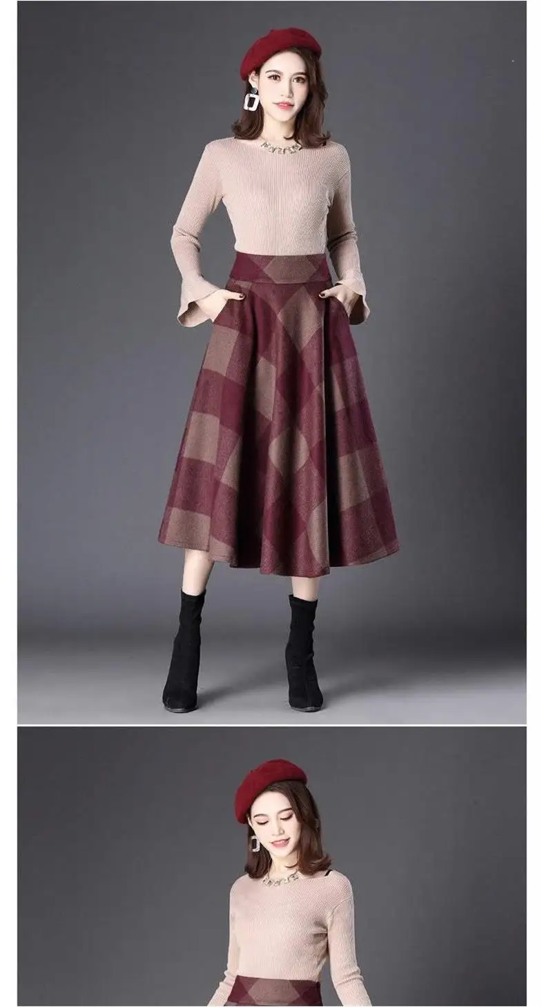 Винтажная клетчатая Женская Зимняя юбка в английском стиле, шерстяная юбка средней длины с высокой талией, элегантные юбки трапециевидной формы размера плюс DF929 <