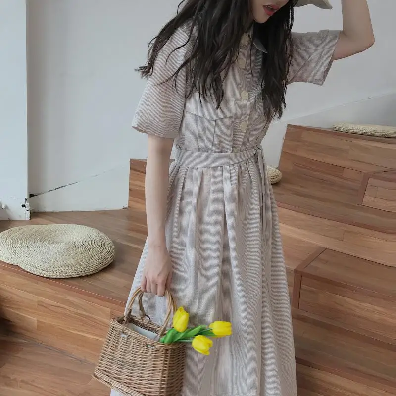 Mori Girl летнее женское длинное платье с отложным воротником, синее Полосатое платье-рубашка, элегантное платье с поясом, негабаритные платья средней длины AE775