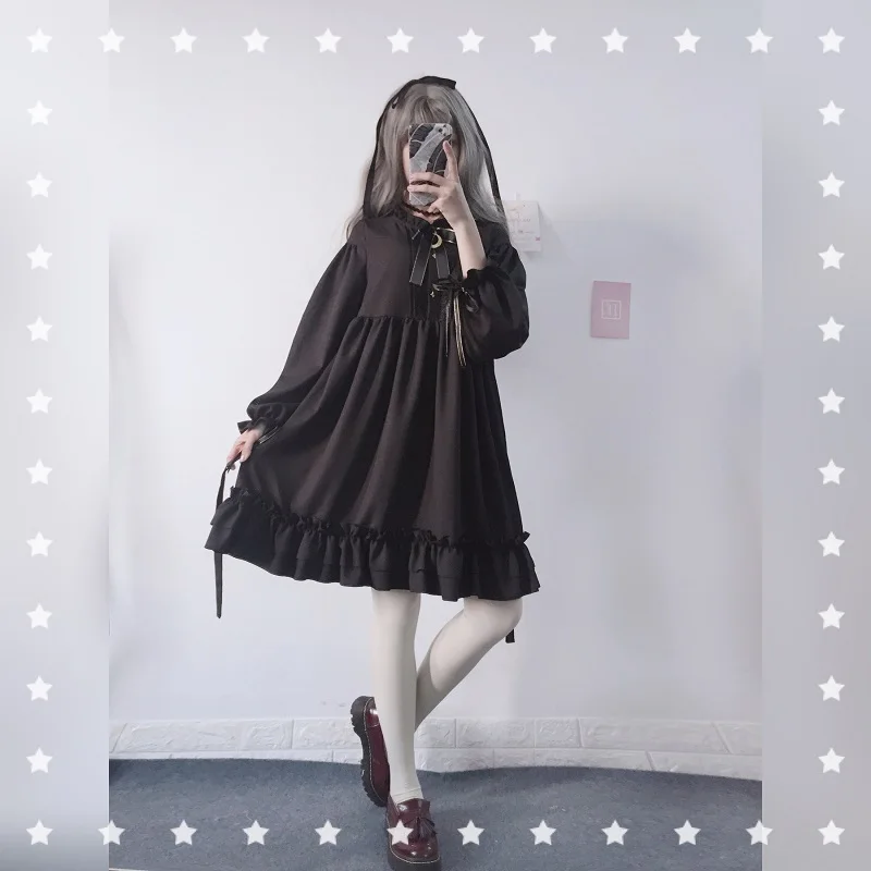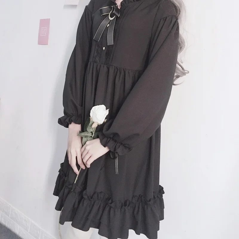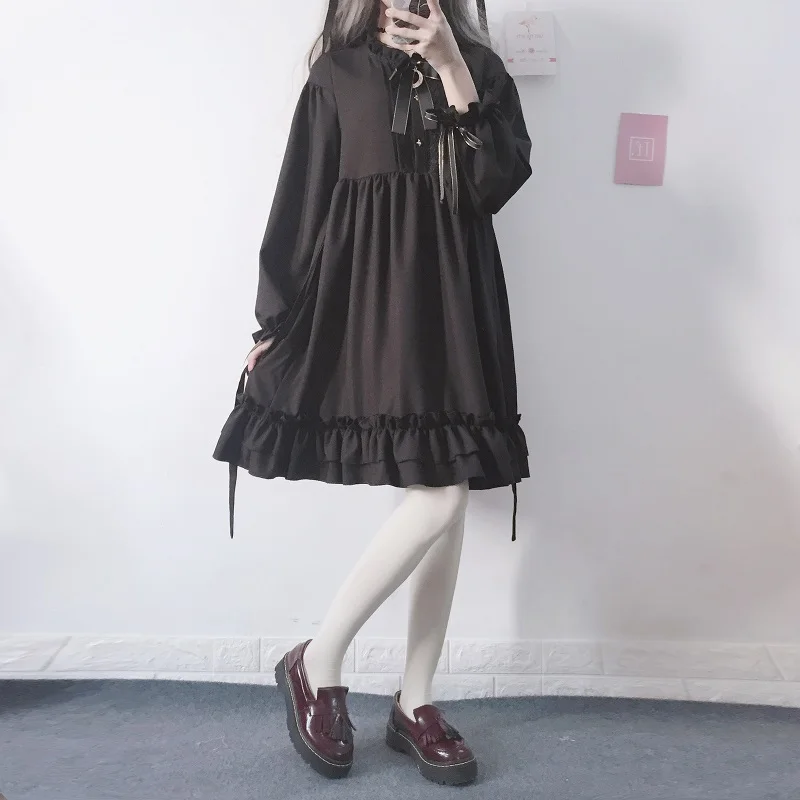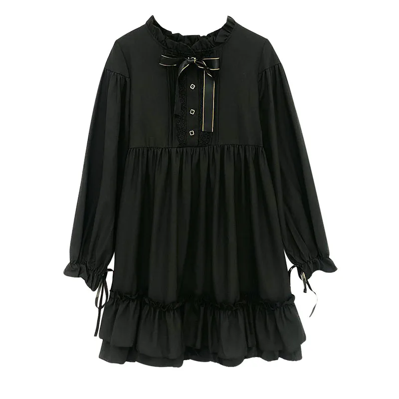 Японское женское черное платье в стиле Харадзюку с оборками, рукав-фонарик, стиль Лолиты, студенческое платье, милое платье с бантом для девочек DC639 <