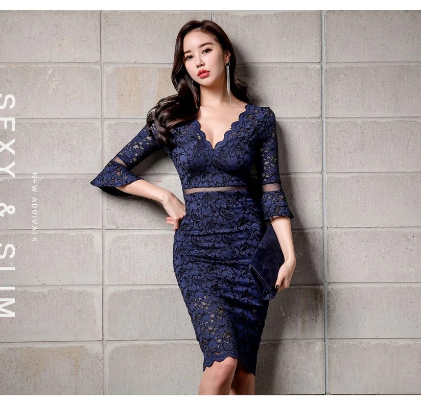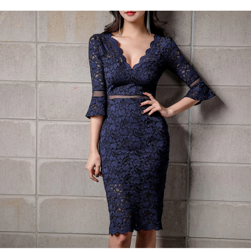 2020 осенние кружевные платья в стиле пэчворк с расклешенными рукавами и v-образным вырезом, офисные женские Сексуальные вечерние облегающие платья-карандаш Vestidos AQ102