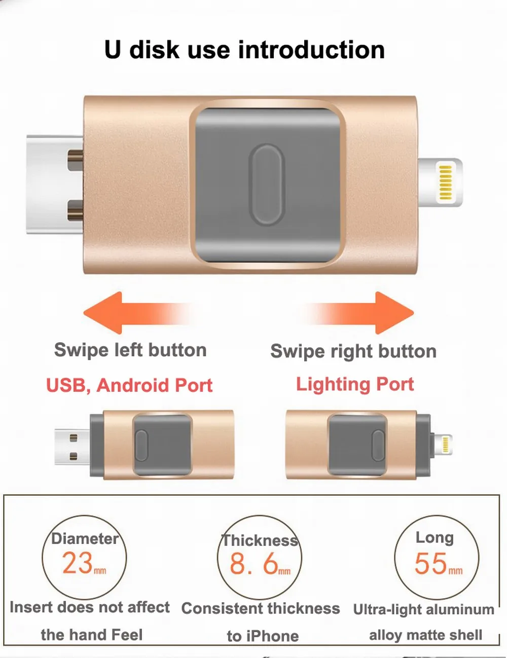 Название продукта: Многофункциональный OTG Мобильный телефон U disk; Характеристики продукта: интерфейс Apple, микро-Интерфейс Android, компьютерный USB Материал изделия: металл; Размер продукта: 55*22,5*9,2 мм; Вес изделия: 29 граммов Свойства чипа: импортные оригинальные высокоскоростные чипы; Доступный объем: 8 ГБ, 16 ГБ, 32 ГБ, 64 ГБ, 128 Гб; Согласно промышленному стандарту U disk storage продукция, фактическая память составляет около 90%; Скорость чтения и записи: интерфейс 3,0/3,1, безопасность чипа на месте, стабильная, Высокоскоростная передача данных (связанная с состоянием настроек компьютера); Протокол перевозки: протокол передачи данных в шинах; Хранение данных: более чем для детей 10 лет, больше, чем 10000 чтения и записи; Характеристики интерфейса: USB2.0/3,0 (совместим с 1,1/1,0), не нужно управлять, подключать и играть; Рабочий ток: 200 мАч; Рабочее напряжение: 5 В; Рабочая температура: -40 °C-+ 70 °C; Температура хранения: -50 ° C - + 80 ° C; Подходящая система: Windows 10/8/7/XP/Vista/XP/2000, Mac OS 9.x/ X, Linux2.4.x и выше; Основное использование: хранение данных файлов, загрузка диска системы и т. Д.