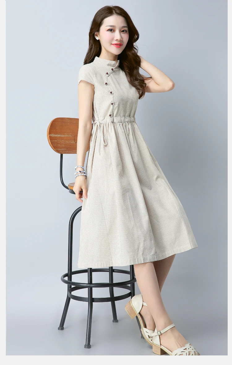Большие размеры для женщин в полоску из хлопка и льна темперамент платье мини-платья для девочек винтажное платье WF718 <