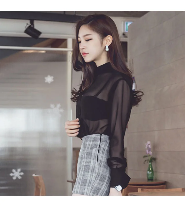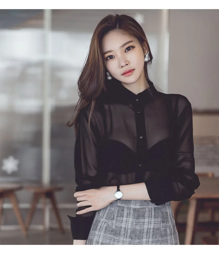 Сексуальные женские блузки Топы 2020 черные шифоновые женские прозрачные блузки с длинным рукавом DF260 <