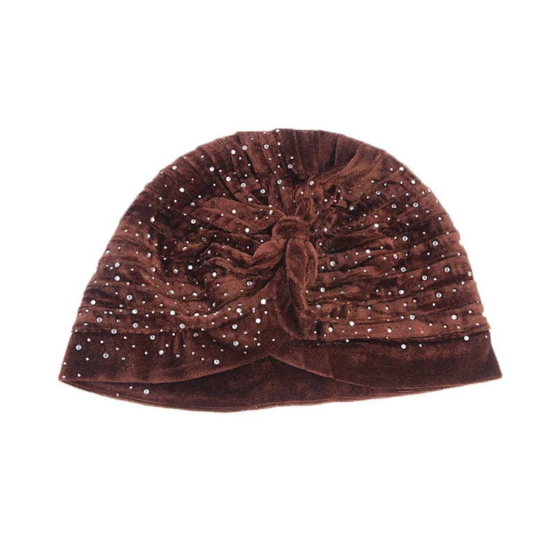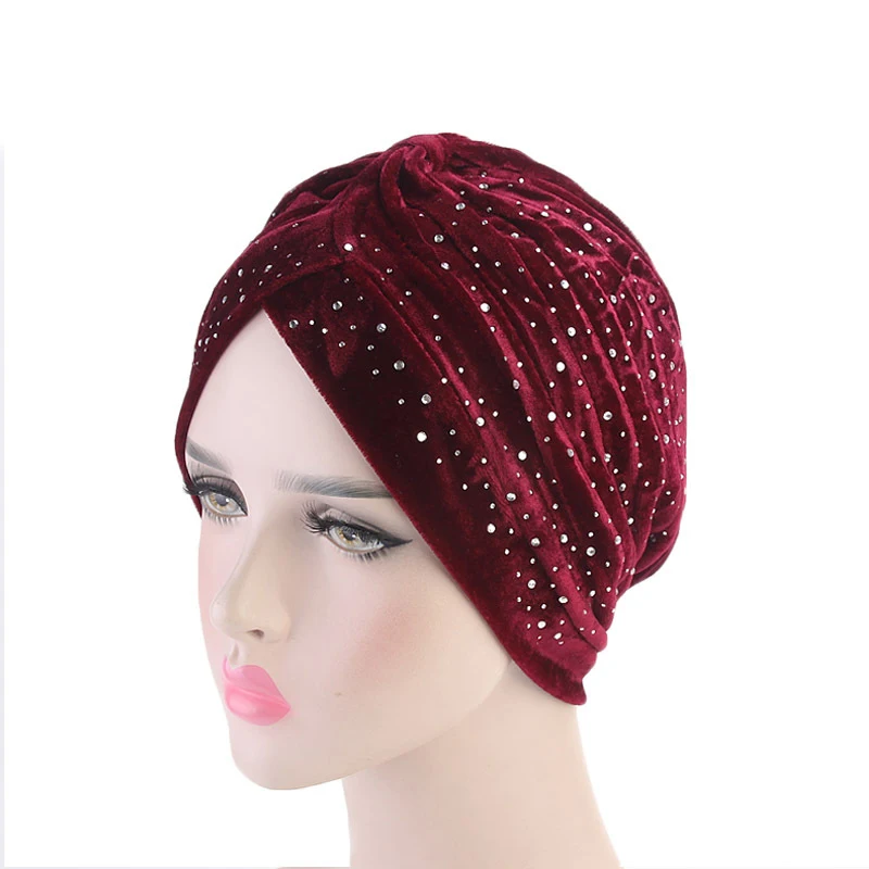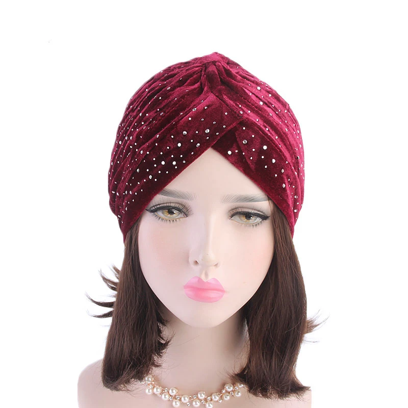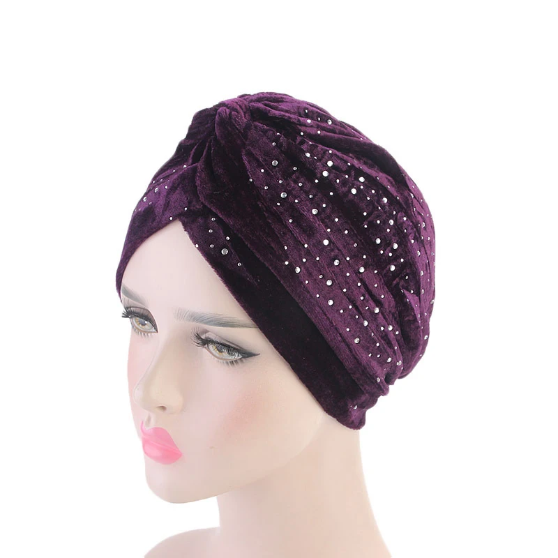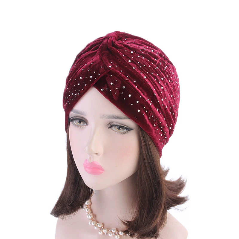 Стразы бархатная тюрбан эластичный твист сплошной Цвет хиджаб Кепка Chemo головные обручи