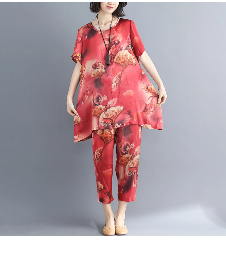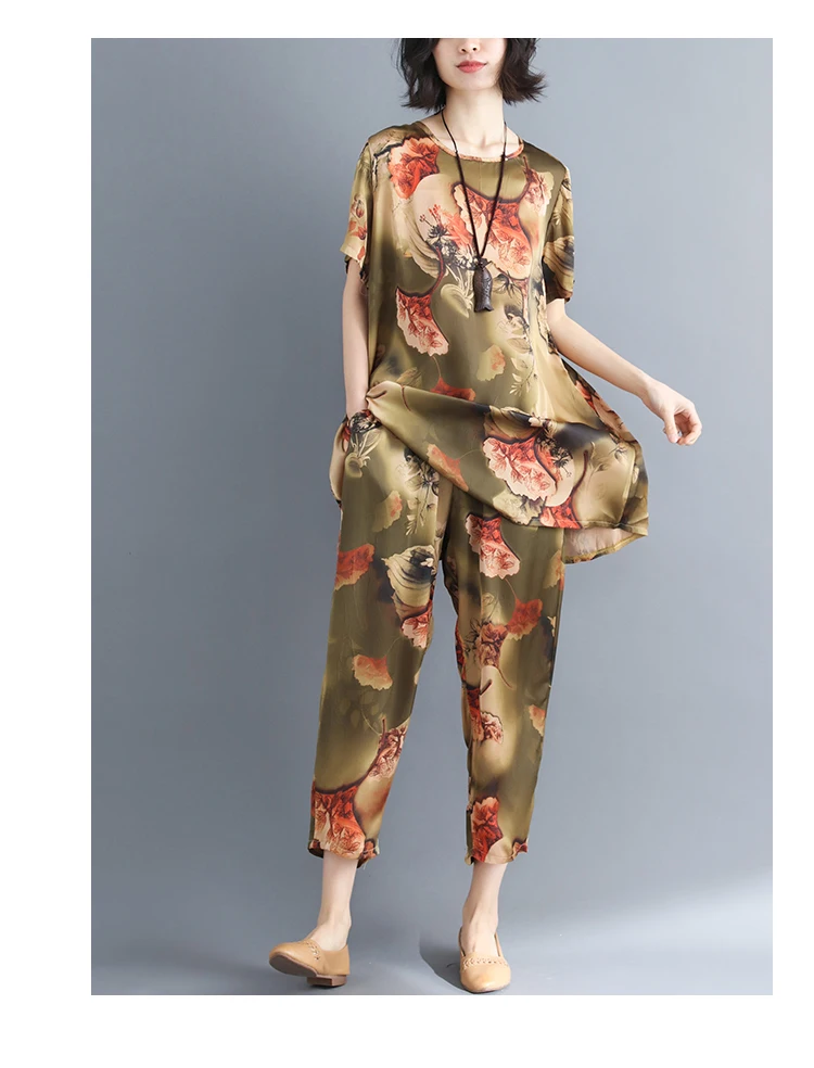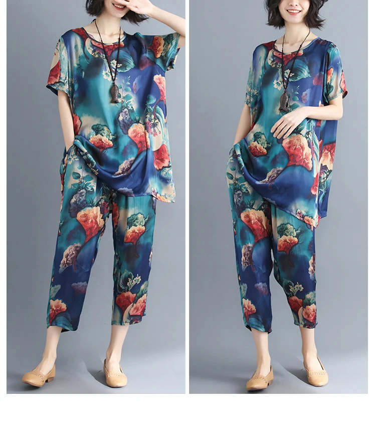 Летние женские свободные костюмы, Новое поступление, большие размеры, женские, гладкие, шелковистые, с принтом, с коротким рукавом, тонкие, два предмета, костюмы AQ134