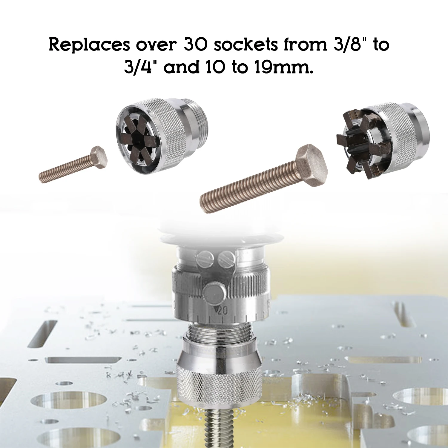 Заменяет более 30 розеток от 3/8 до 3/4 и 10 до 19 мм.