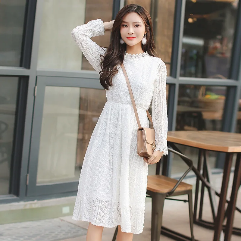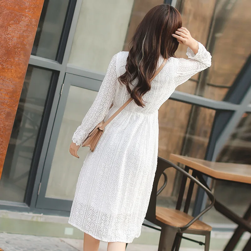 Женское элегантное кружевное платье, женское белое платье Vestidos, свободная талия, длинный рукав, праздничное платье DV927