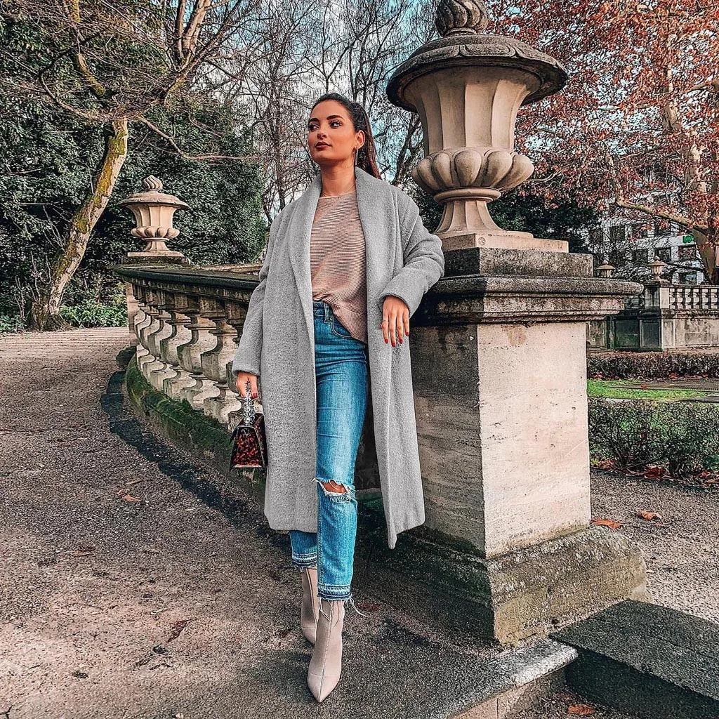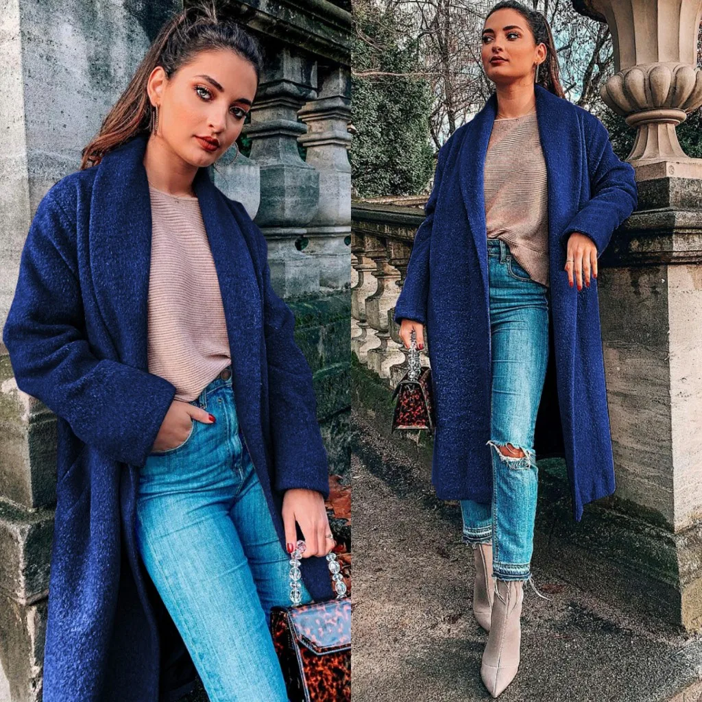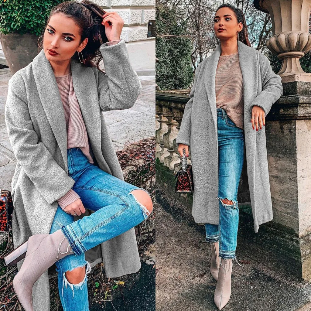 Женская мода с длинным рукавом куртки сплошной цвет свободного покроя пальто с поясом Топы