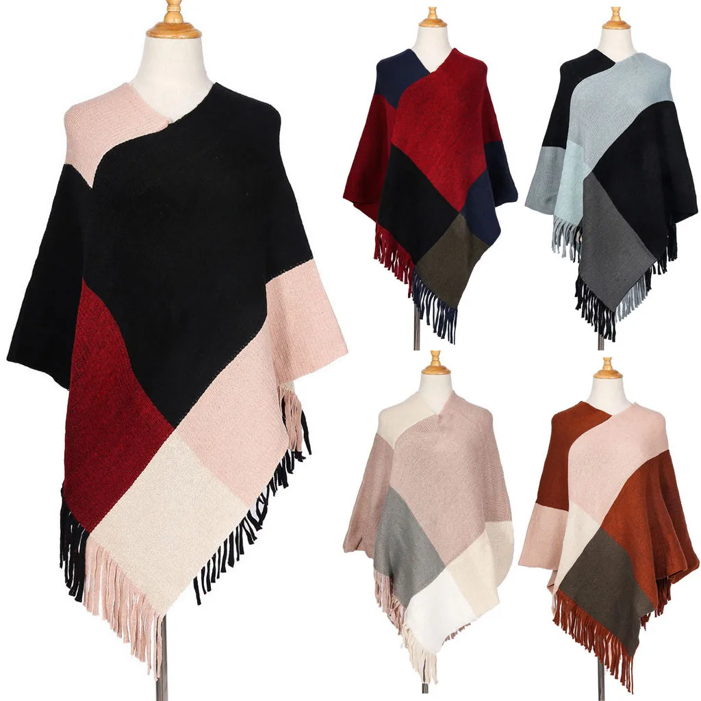 Зимний плащ для женщин, вязаные клетчатые накидки, шаль, кашемировое пальто с кисточками, пончо Mujer Invierno Elegantes, пончо для женщин
