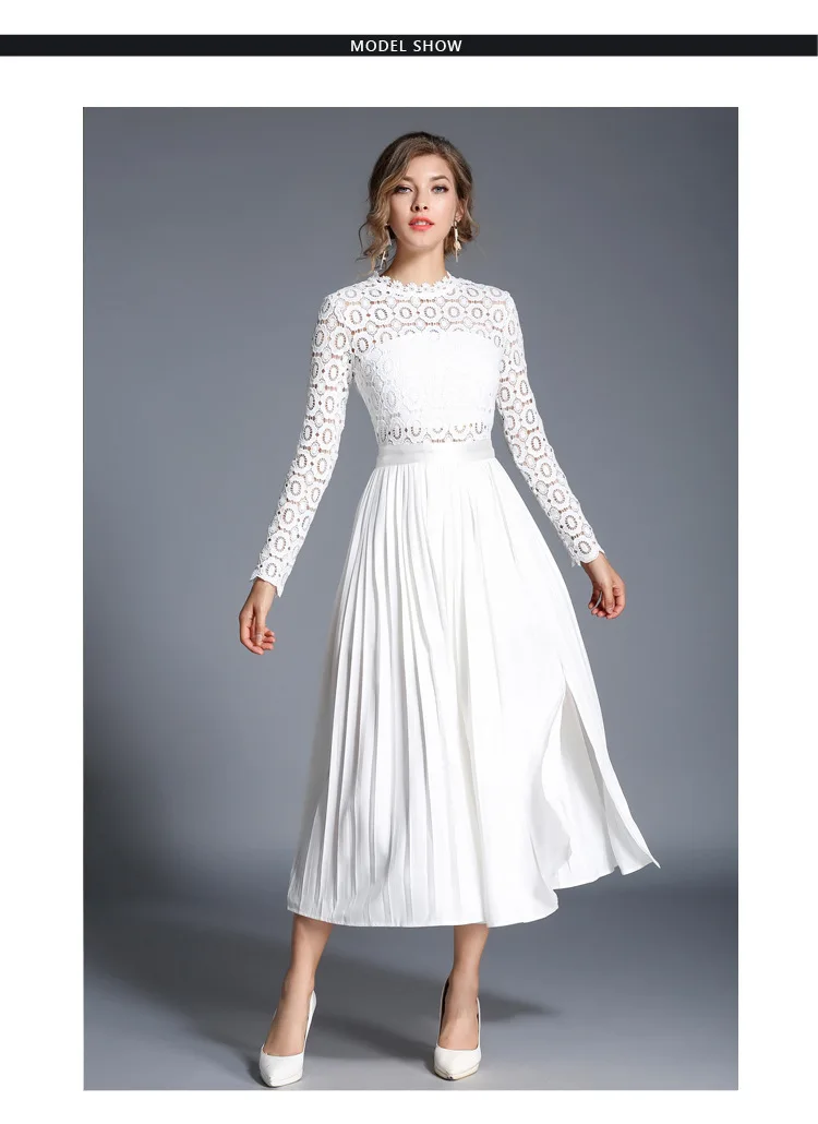 2020 осеннее женское кружевное лоскутное Плиссированное Макси платье vestidos облегающее белое вечернее платье с длинным рукавом и круглым вырезом DC423 <