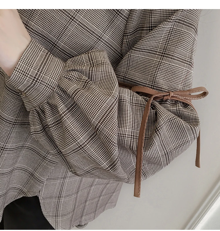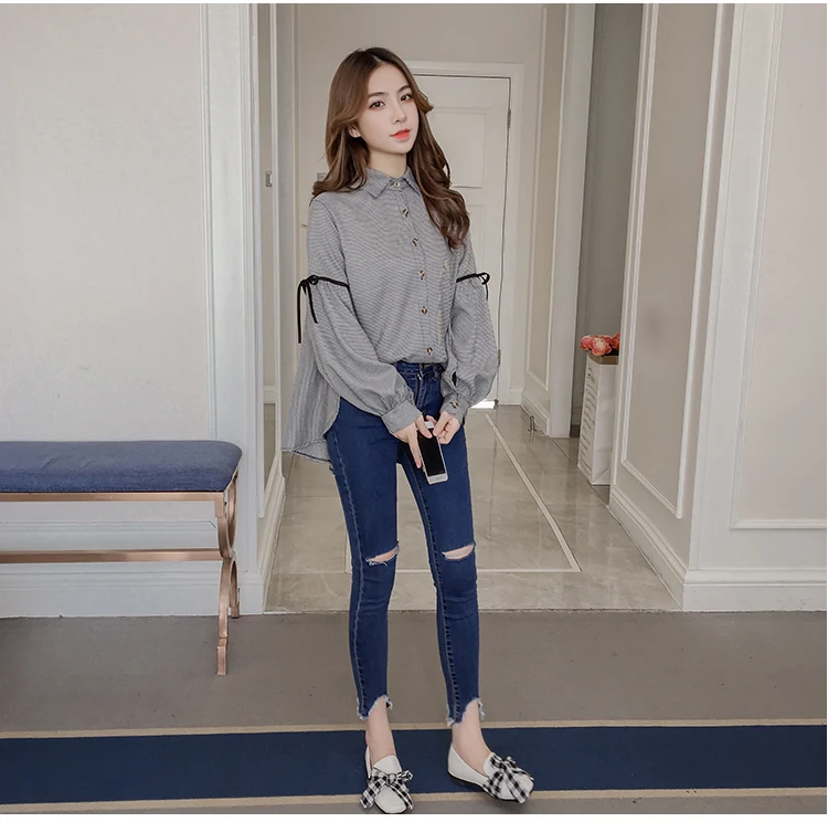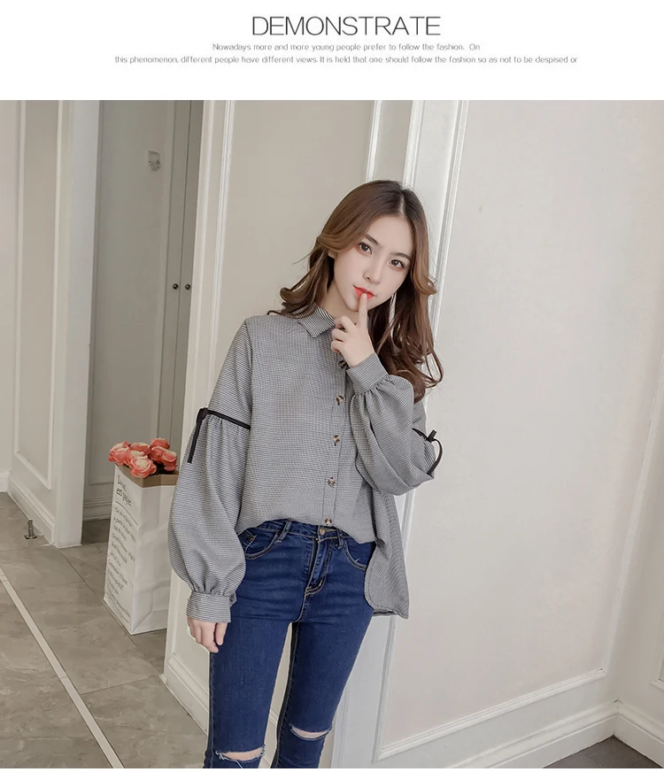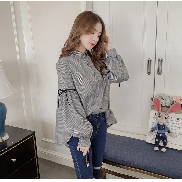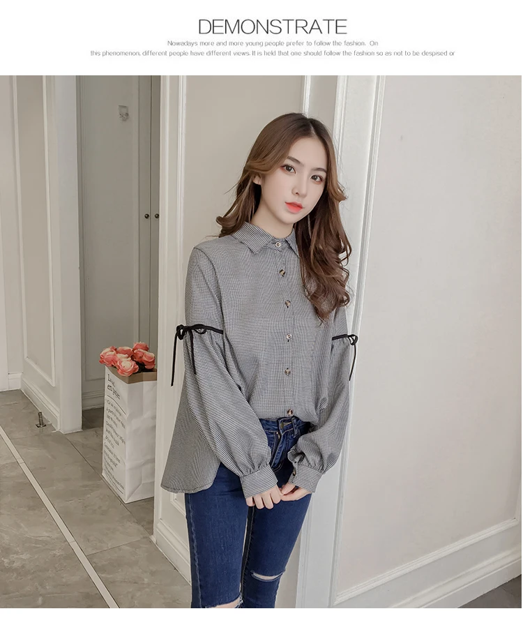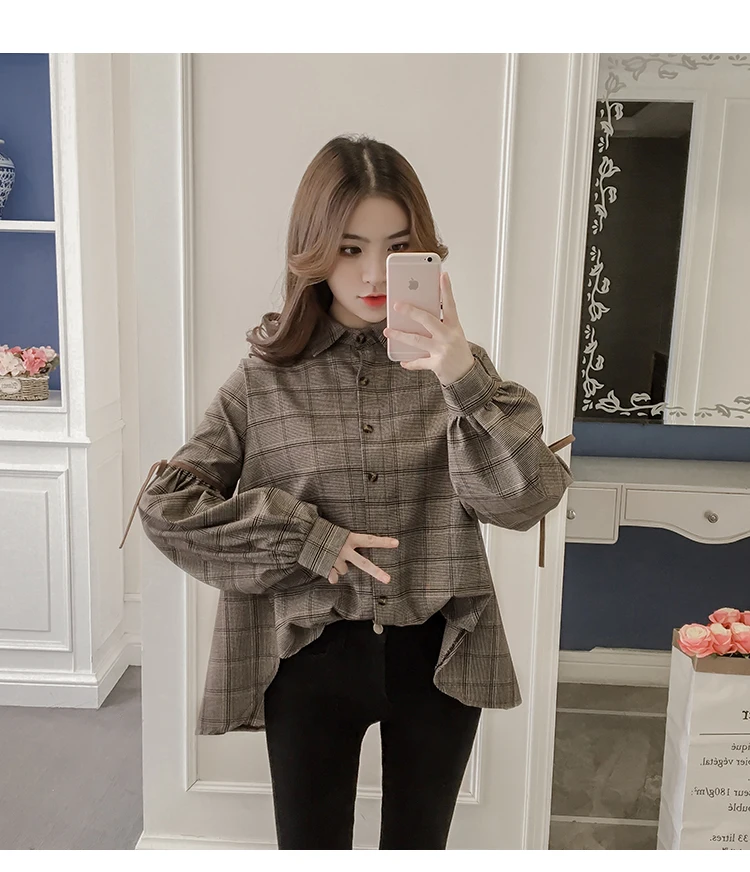 Харадзюку клетчатая женская блузка с длинным рукавом и отложным воротником с бантом kawaii женская рубашка Топы спереди короткие сзади длинные блузки DF625 <