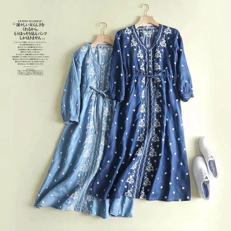 Осень 2019, винтажное богемное платье, женское платье с v-образным вырезом и цветочной вышивкой размера плюс, джинсовая рубашка, платья, женская одежда AQ940
