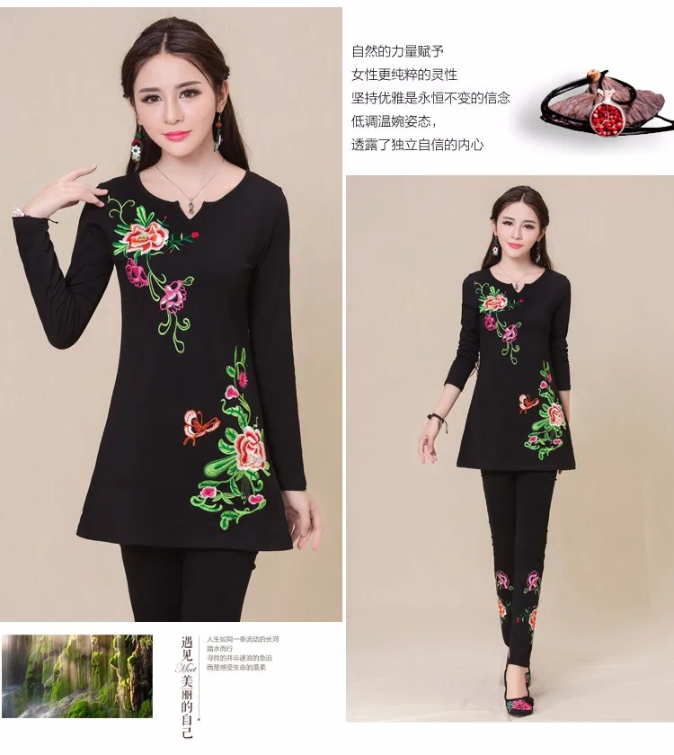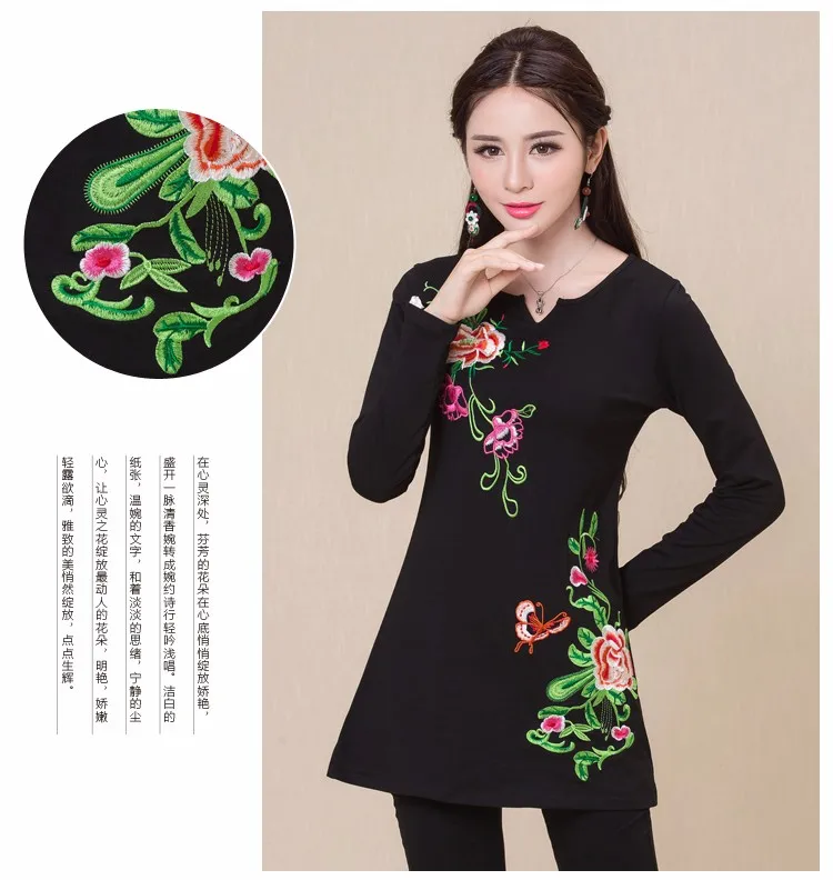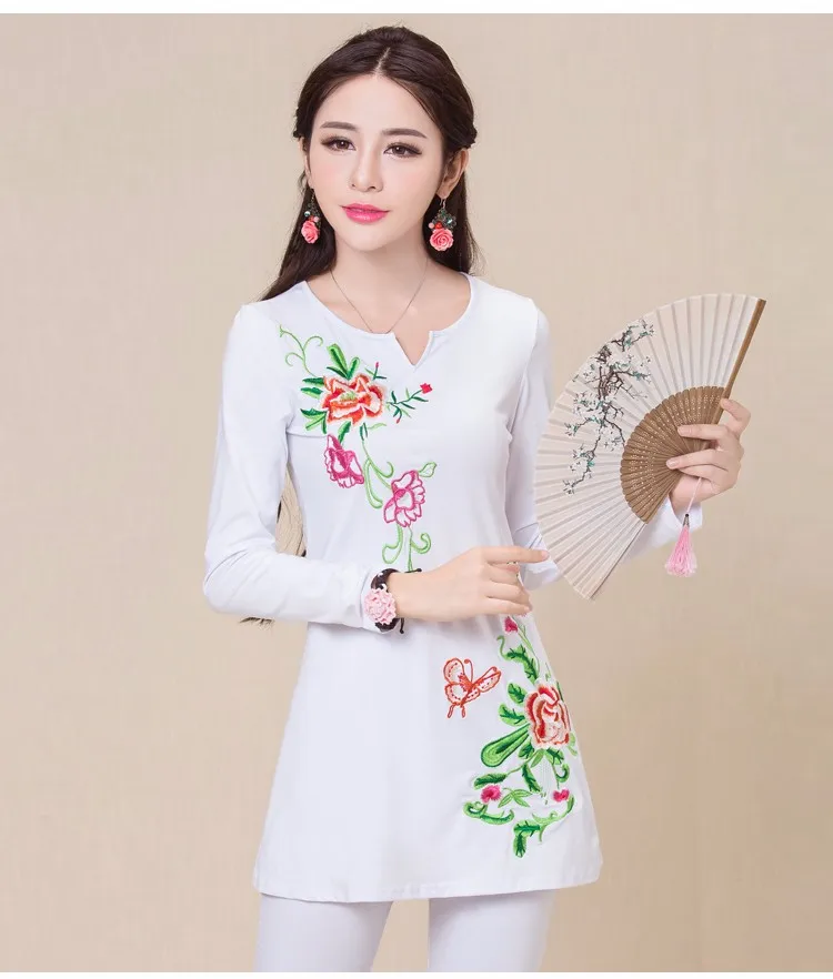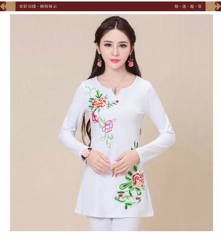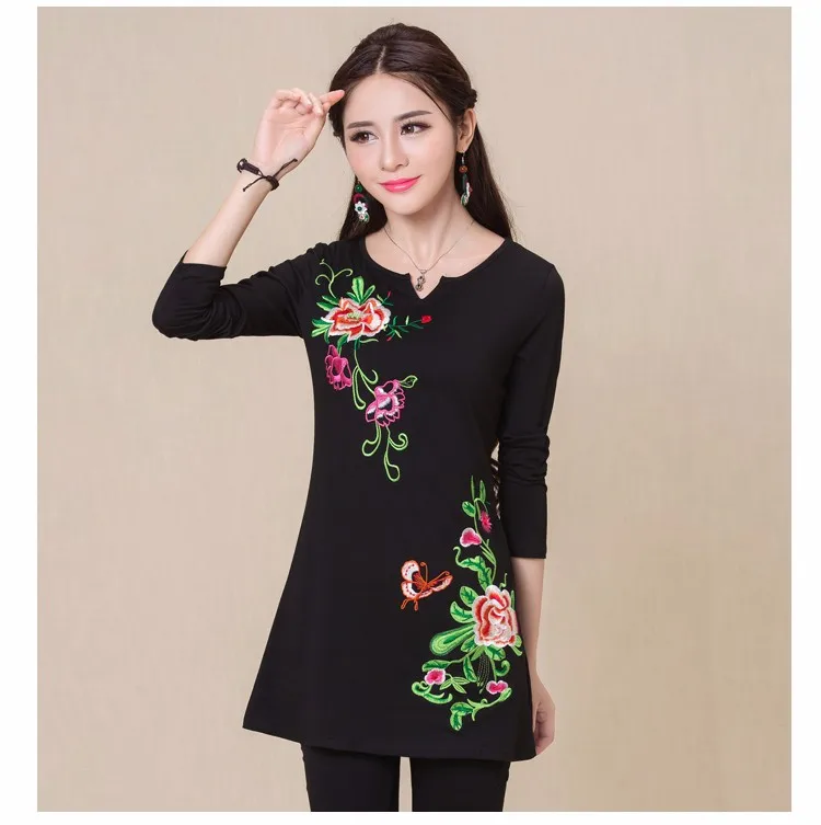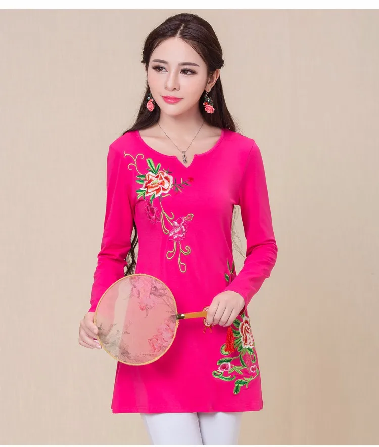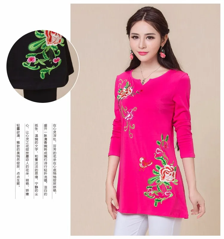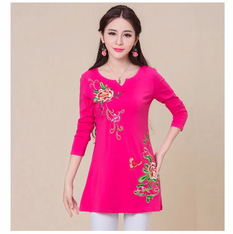 Camisas femininas 2020, Женская Осенняя M-5XL, этнический v-образный вырез, длинный рукав, черный, зеленый, розовый, красный, белый, вышивка, футболка, топы
