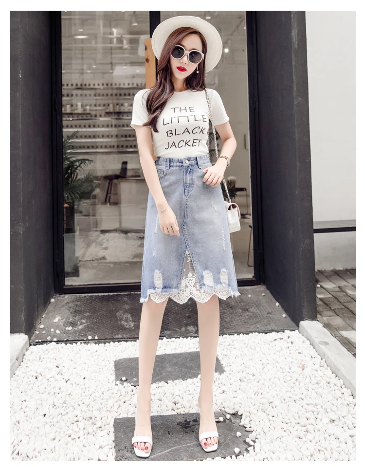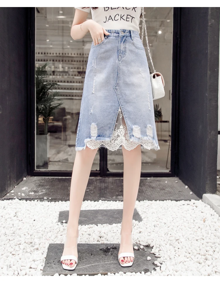 Женские джинсовые юбки с высокой талией, новинка 2020, рваные кружевные лоскутные трапециевидные джинсы MIDI, Женская юбка jupe jean femme AQ168
