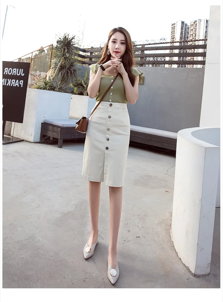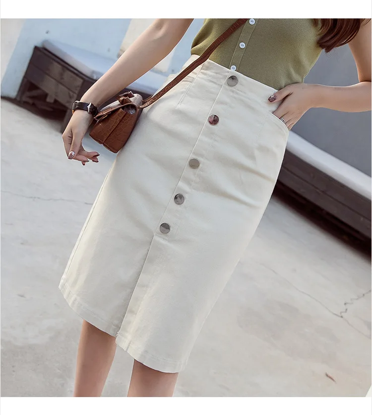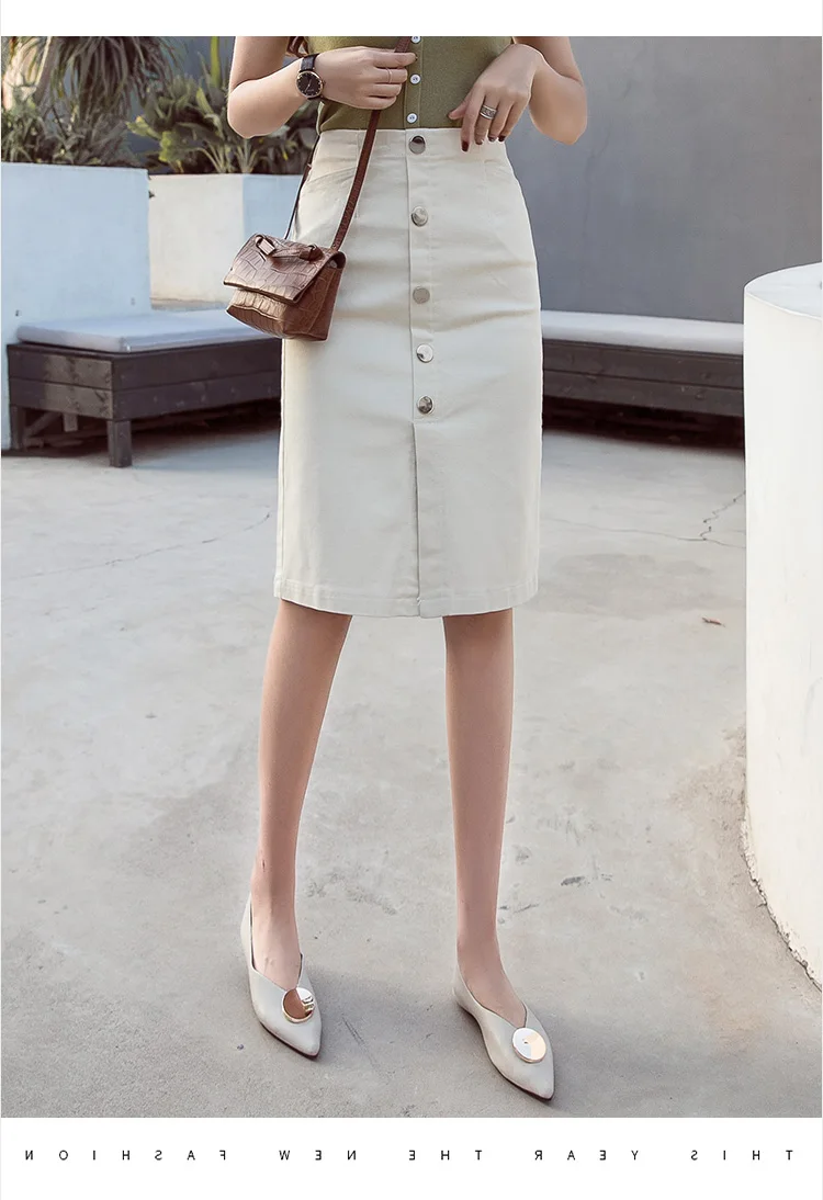 Однобортная женская джинсовая юбка с высокой талией, уличная одежда, стрейчевая облегающая женская юбка-карандаш, 2020, белая джинсовая юбка с карманами, AE121