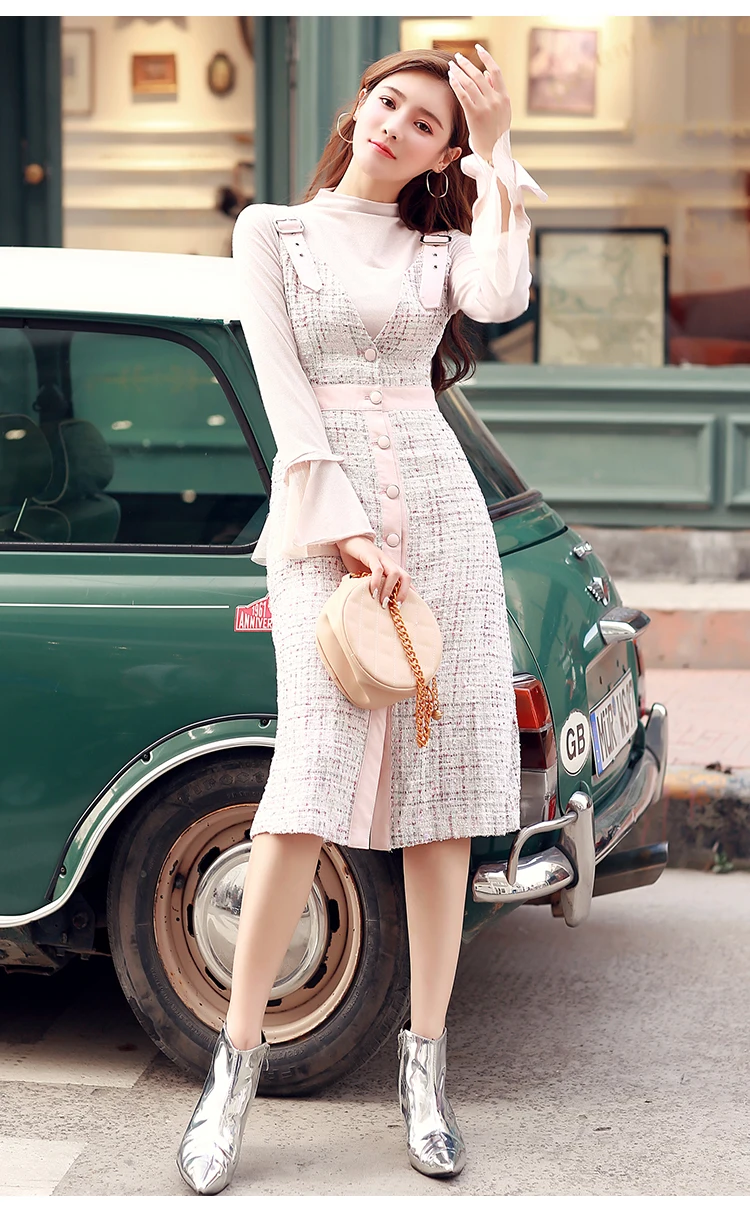 Взлетно-посадочной полосы твид, платье на бретельках, 2020 осень-зима Для женщин Винтаж однобортное пальто с v-образным вырезом облегающее вечерние платье DF286 <