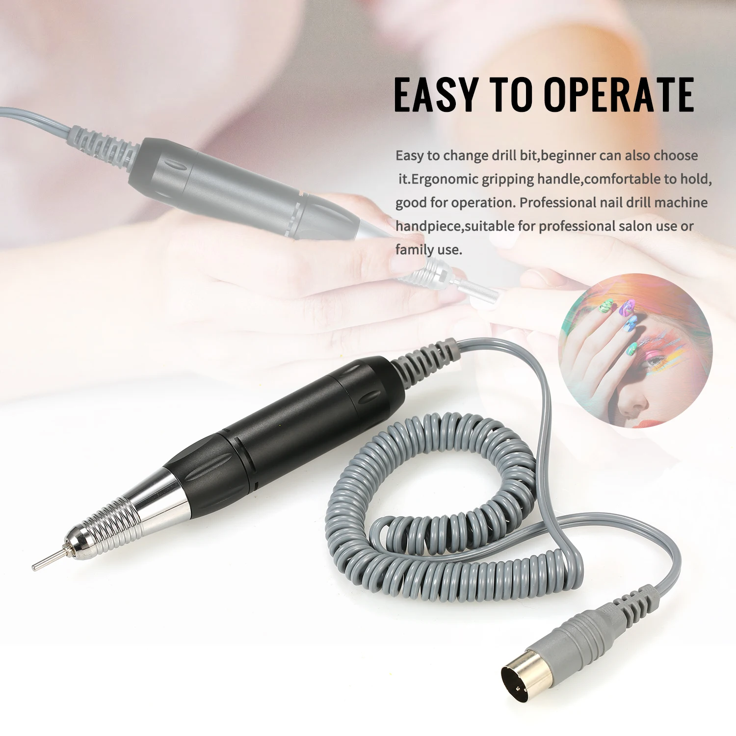 Легко управлять --- легко менять сверло, новичок также может выбрать его. Эргономичная захватывающая ручка, удобно держать, хорошо подходит для работы. Профессиональная машинка для сверления ногтей, подходит для профессионального использования в салонах или для семейного использования.