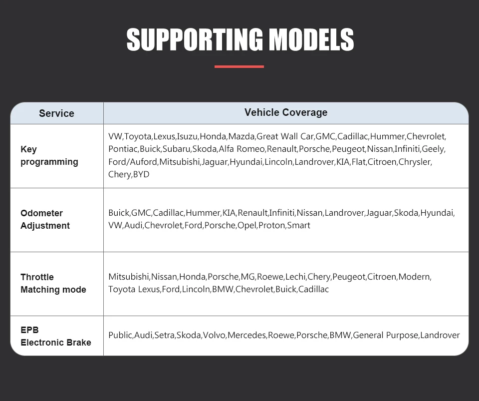 Ключевые программисты: для VW, для Toyota, для Lexus, для Isuzu, для Honda, для Mazda, для Great Wall Car, для GMC, для Cadillac, для Hummer, для Chevrolet, для Pontiac, для Buick, для Subaru, для Skoda, для Alfa Romeo, для Renault, для Porsche, для Peugeot, для Nissan, для Infiniti, для Geely, для Ford/Auford, для Mitsubishi, для Jaguar, для Hyundai, для Lincoln, для Landrover, для KIA, для Flat, для Citroen, для Chrysler, для Chery, для BYD одометра Adujustment: Для Buick, для GMC, для Cadillac, для Hummer, для KIA, для Renault, для Infiniti, для Nissan, для Landrover, для Jaguar, для Skoda, для Hyundai, для VW, для Audi, для Chevrolet, для Ford, для Porsche, для Opel, для Proton, для Smart (Пожалуйста, проверьте перед заказом) режим соответствия дроссельной заслонки: для Mitsubishi, для Nissan, для Honda, для Porsche, для MG, для Roewe, для Lechi, для Chery, для Peugeot, для Citroen, для модерна, для Toyota для Lexus, для Ford, для Lincoln, для BMW, для Chevrolet, для Buick, для Cadillac EPB: для общественных мест, для Audi, для Setra, для Skoda, для Volvo, для Mercedes, для Roewe, для Porsche, для BMW, для общего назначения, для Landrover