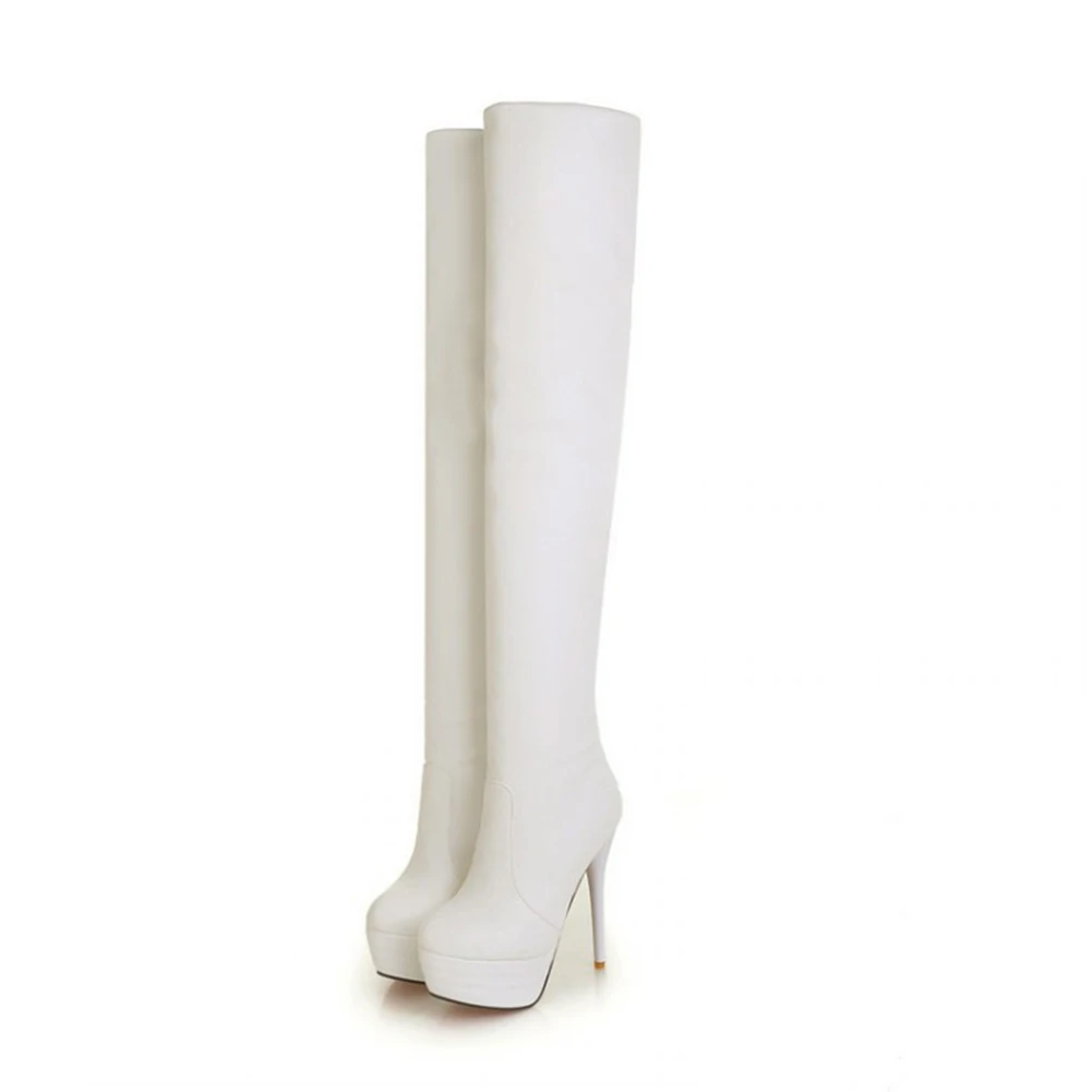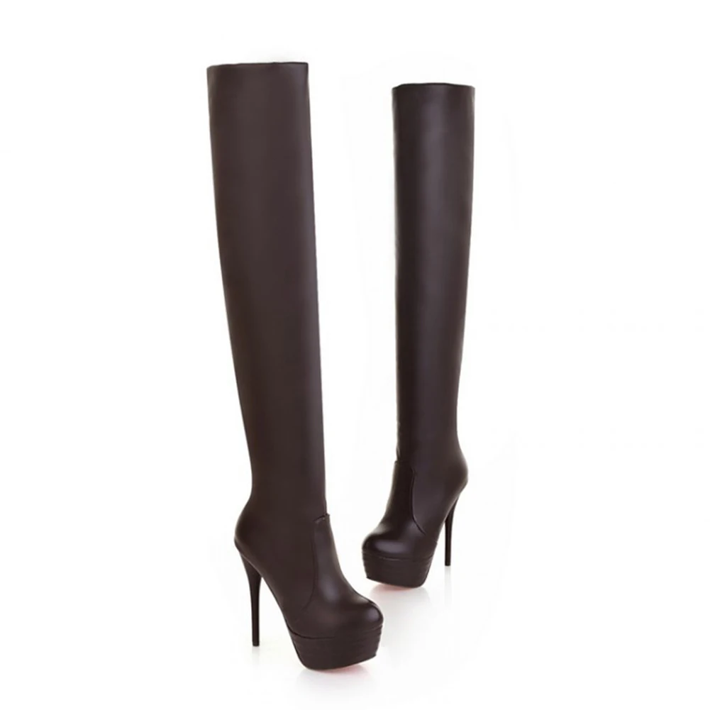 Сапоги выше колена из мягкой кожи на платформе с круглым носком на высоком тонком каблуке