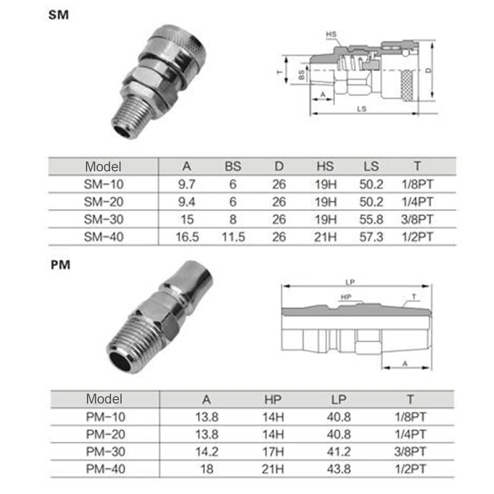 Технические параметры Использование жидкости: воздух Сопротивление давлению: 1,32 МПа (1.35 кгс/см2) Максимальное рабочее давление: 0-0.9Mpa (0-9.2kgf/cm2) Температура окружающей среды и жидкости: 0-60 градусов Цельсия применимый шланг: ПУ шланг. Нейлоновая трубка Материал: цинковый сплав SM20/PM20: подходит для внутренней резьбовой воздушной трубы 1/4" SM30/PM30: подходит для внутренней резьбовой воздушной трубы 3/8" SM40/PM40: подходит для 1/2 "внутренней резьбовой воздушной трубы