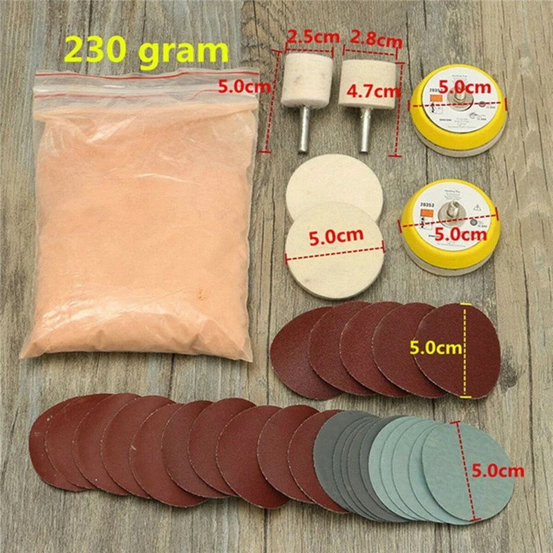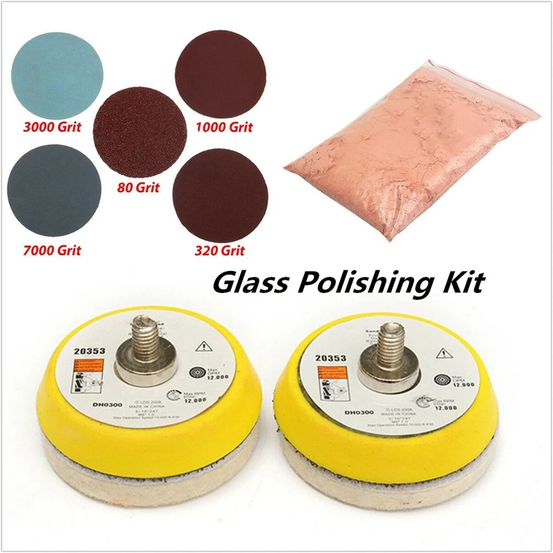 Фитинг: Набор для глубокой очистки стекол от царапин. Емкость порошка оксида церия: 8 унций (230 г) диаметр полировального колеса войлока: 2 см/3 см. Диаметр полировальной площадки войлока: 50 мм/2 дюйма. Войлочный полировальный диск Диаметр: 50 мм/2 дюйма. Диаметр адаптера сверла: 6 мм/0,24 дюйма. Наждачная бумага коробка Зернистость: 80/320/1000/3000/7000