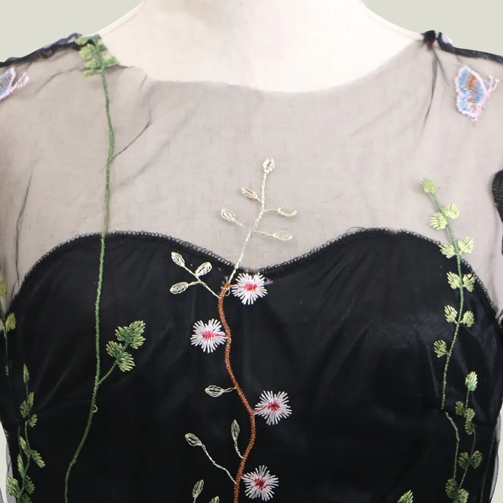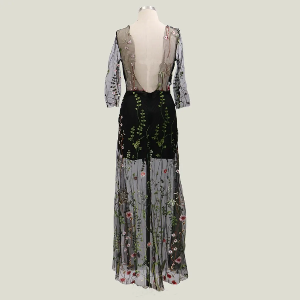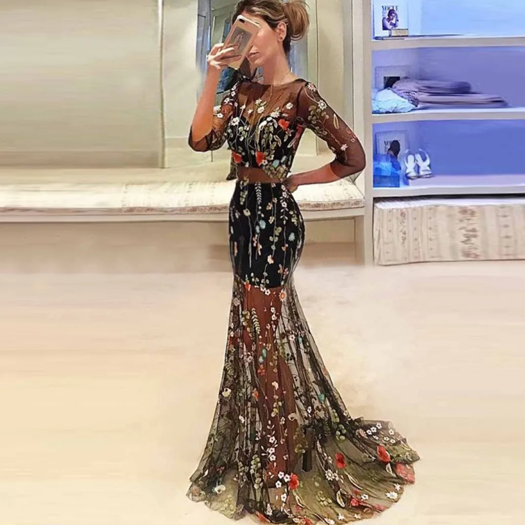 Женское вечернее платье с вышивкой, черное сексуальное облегающее платье с коротким рукавом, глубоким v-образным вырезом и открытой спиной, длинное платье для выпускного вечера, новинка 2019