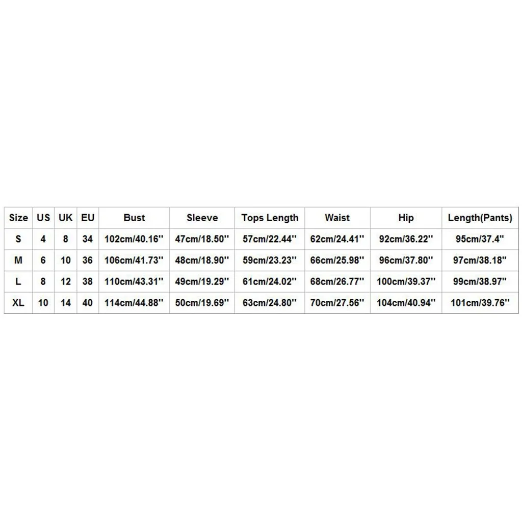 Размер Свяжитесь с нами Великобритания ЕС Обхват груди Рукава Длина топа; Длина Обхват талии Обхват бедер Длина одежды (брюки) S 4 8 34 102 см/40,16'' 47 см/18,50'' 57 см/22,44'' 62 см/24,41'' 92 см/36,22'' 95 см/37,4" М 6 10 36 106 см/41,73'' 48 см/18,90'' 59 см/23,23'' 66 см/25,98'' 96 см/37,80'' 97 см/38,18" L 8 12 38 110 см/43,31'' 49 см/19,29'' 61 см/24,02'' 68 см/26,77'' 100 см/39,37'' 99 см/38,97" XL 10 14 40 114 см/44,88'' 50 см/19,69'' 63 см/24,80'' 70 см/27,56'' 104 см/40,94'' 101 см/39,76''
