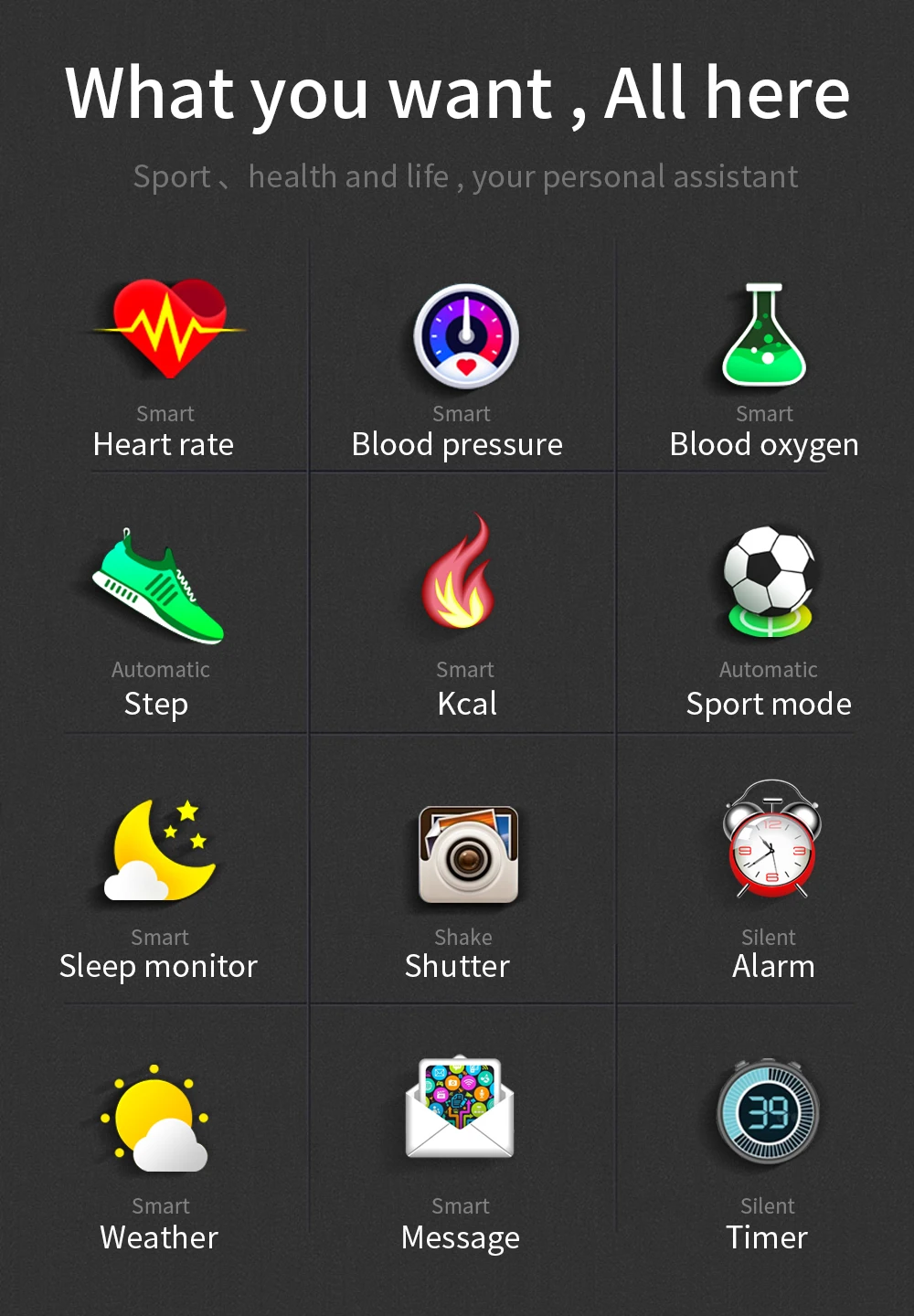 * Все-в-одном наручные часы --- шагомер, счетчик калорий, трекер для здоровья, напоминание о малоподвижности, удаленные фотографии, управление музыкой, напоминание о звонках, будильник, прогноз погоды, уведомление push для электронной почты, SMS, Facebook, Twitter, Skype, WhatsApp и т. Д.