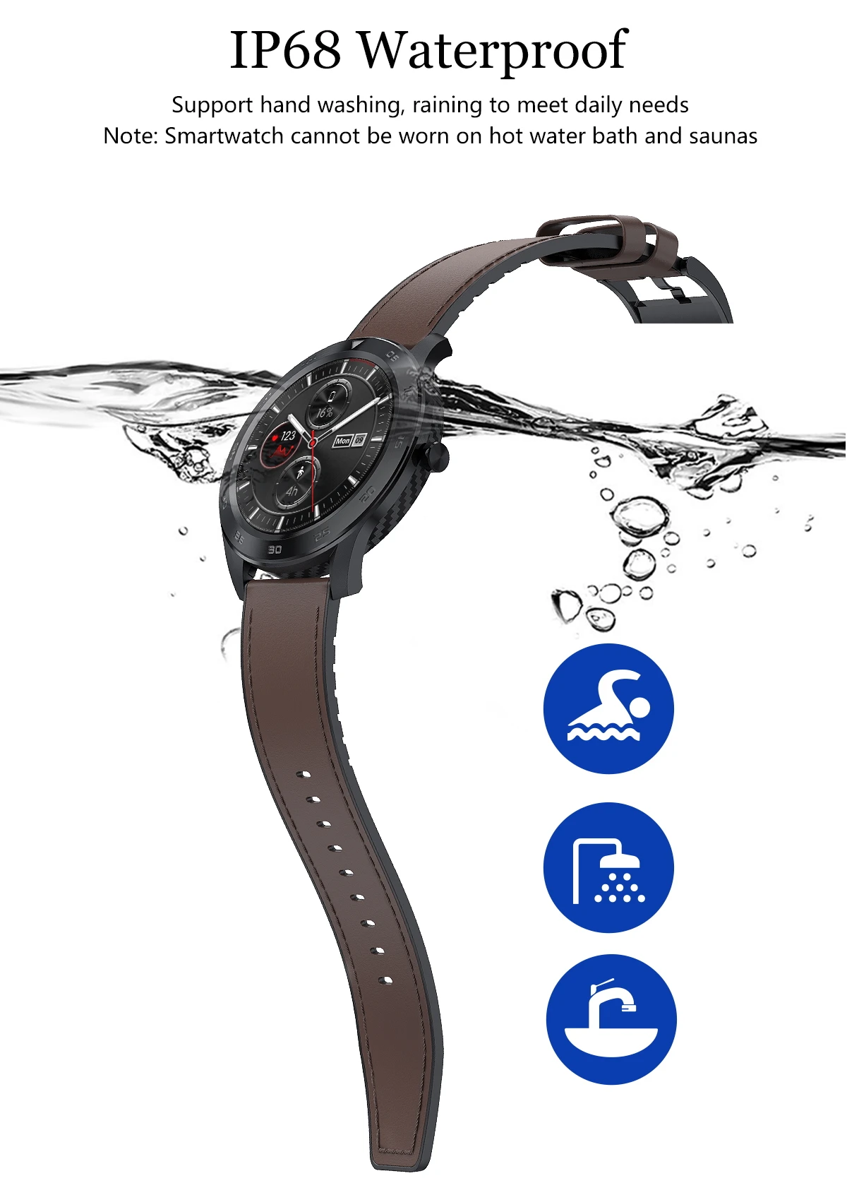 Поддержка ручной стирки, дождь для удовлетворения повседневных потребностей Примечание: Смарт-часы нельзя носить на горячей воде и сауне