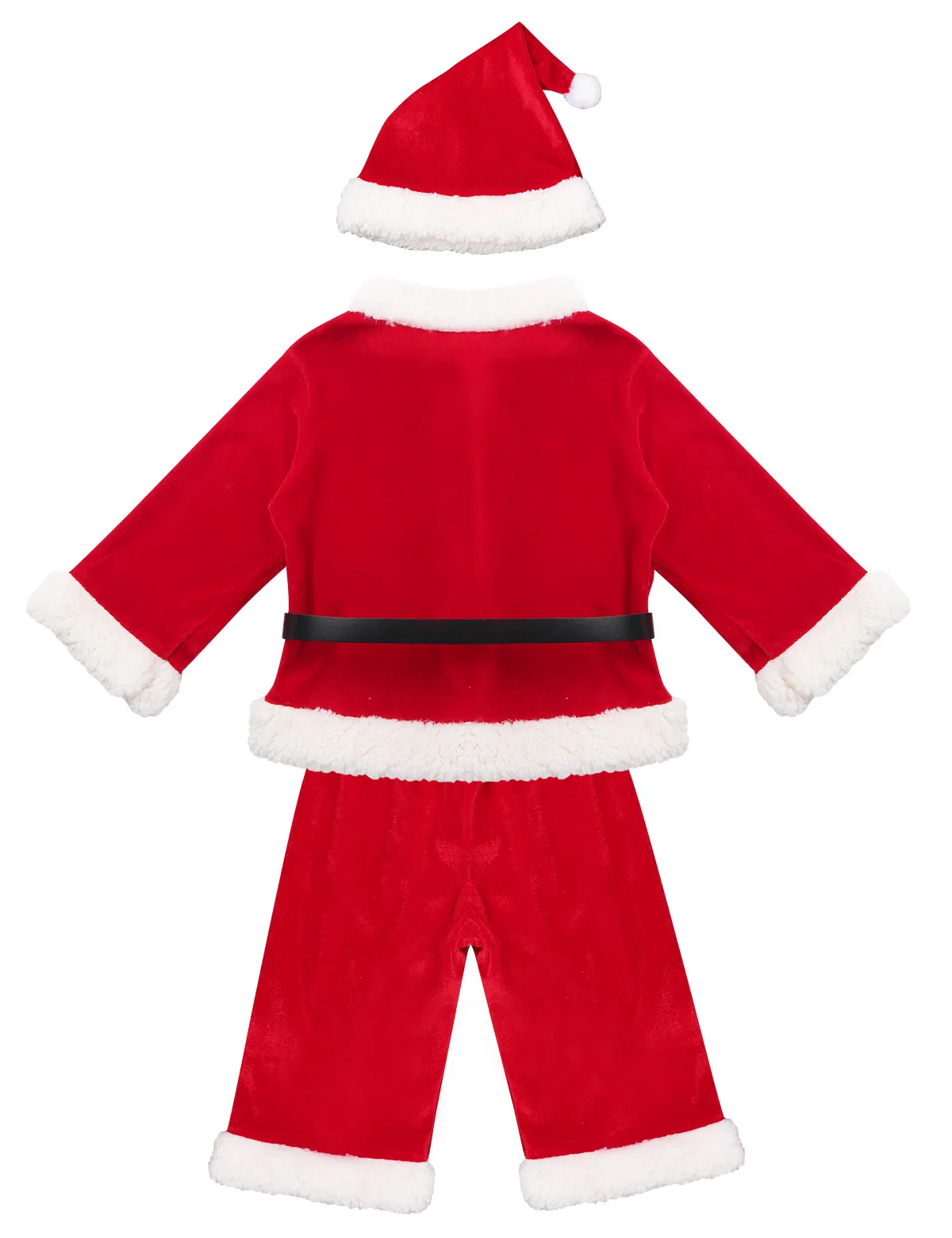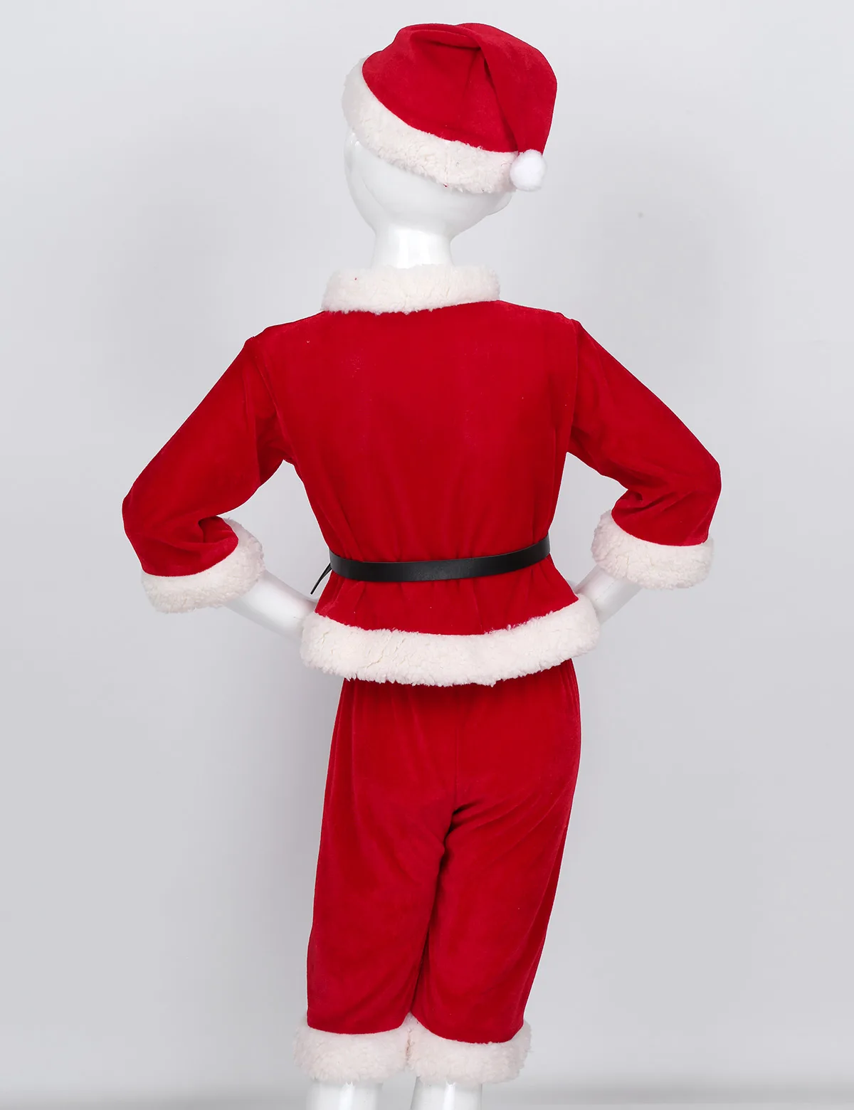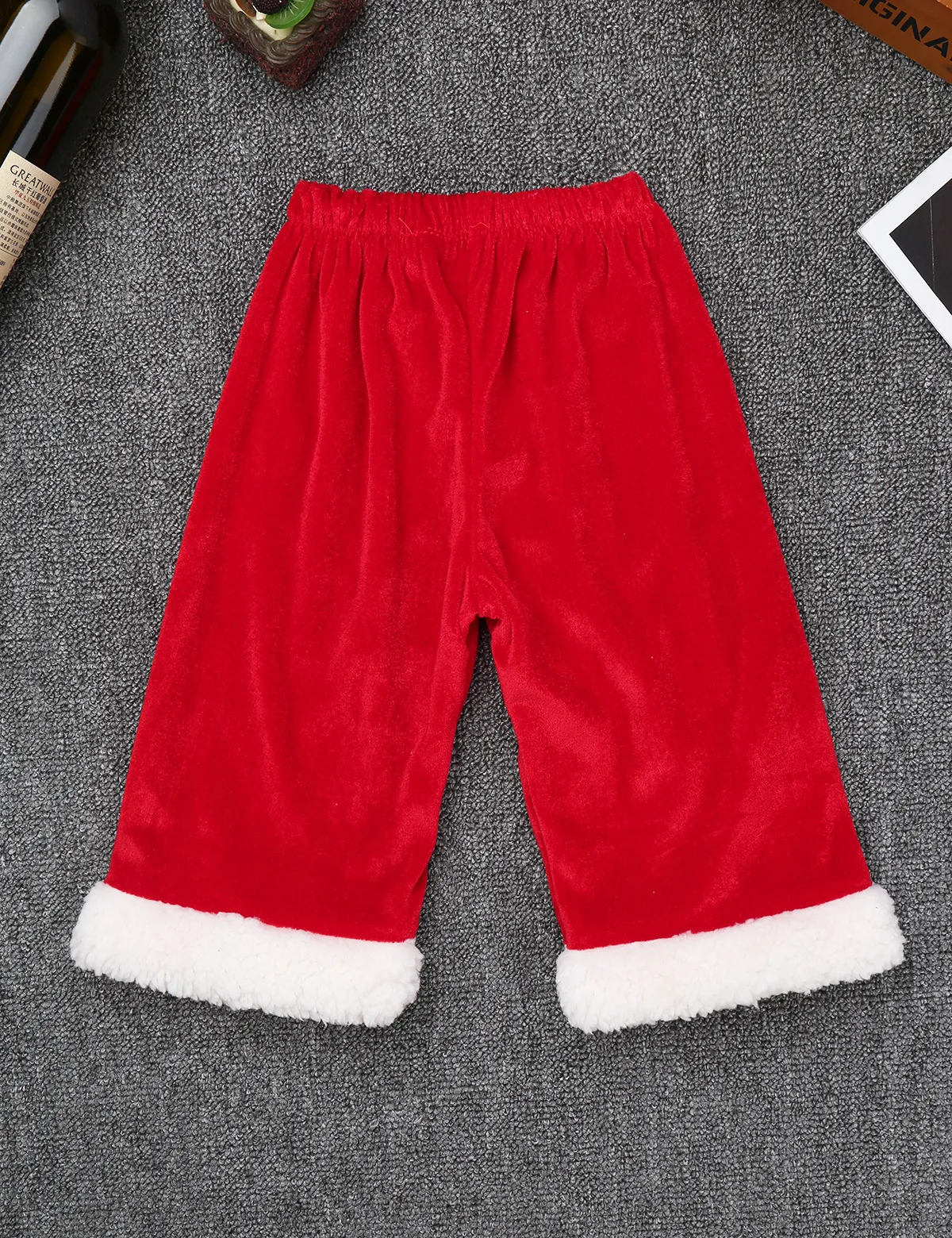 Красный топ и брюки с белой отделкой из искусственного меха. Мягкая и дышащая ткань, теплая и удобная в носке. В комплекте ремень из искусственной кожи и шляпа.