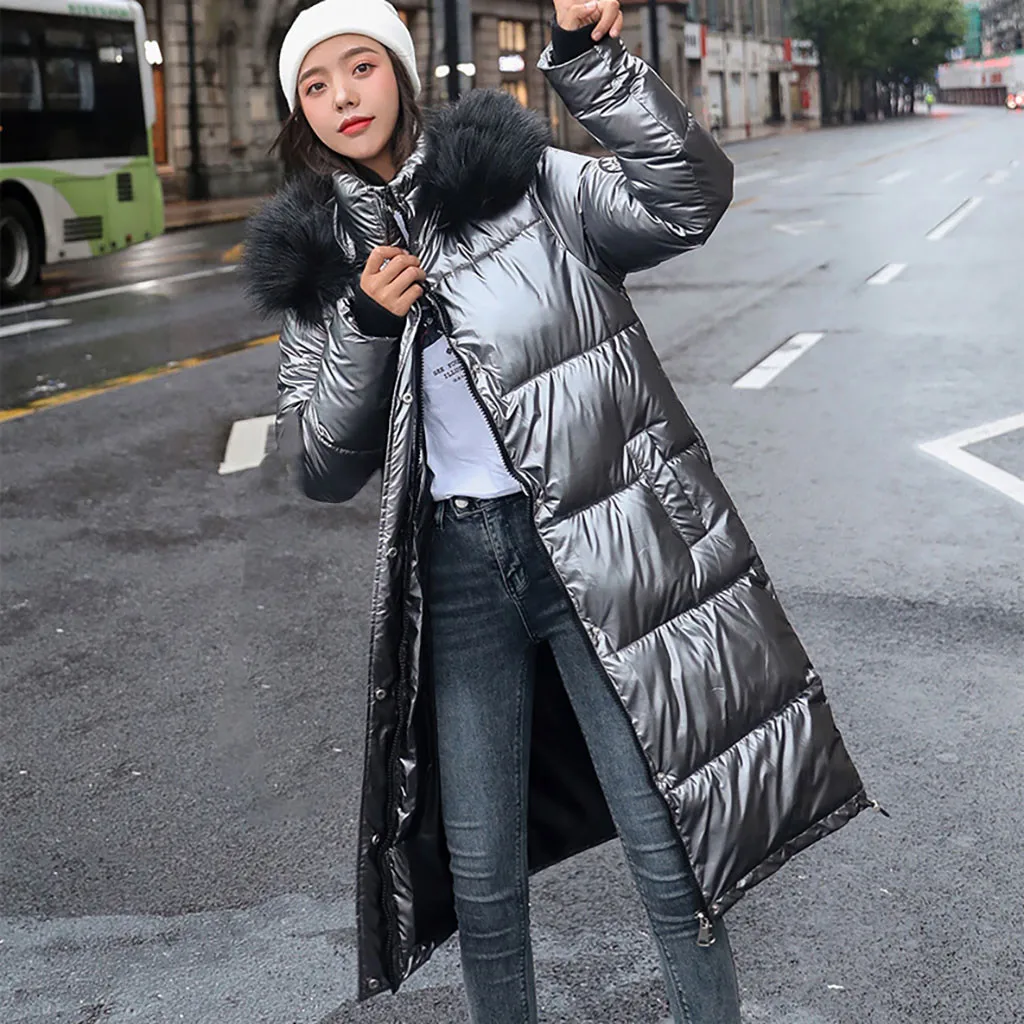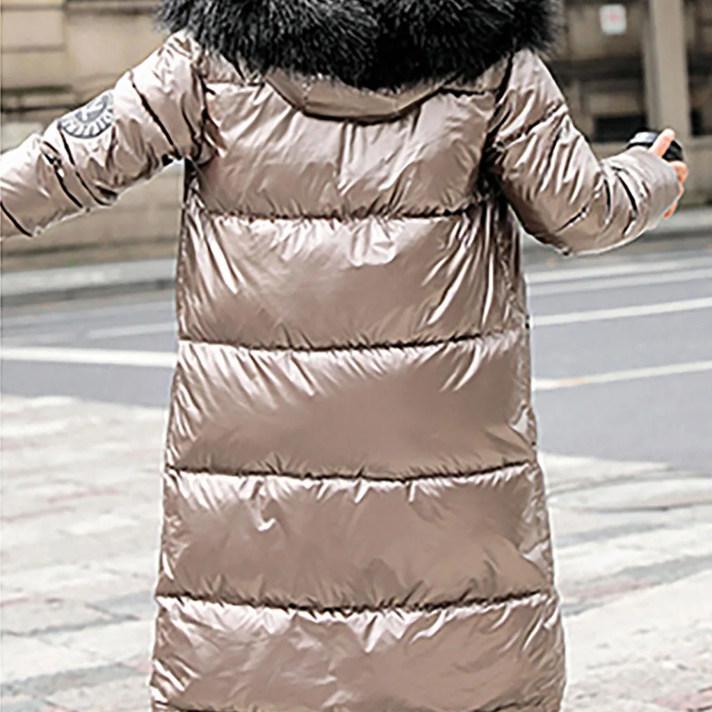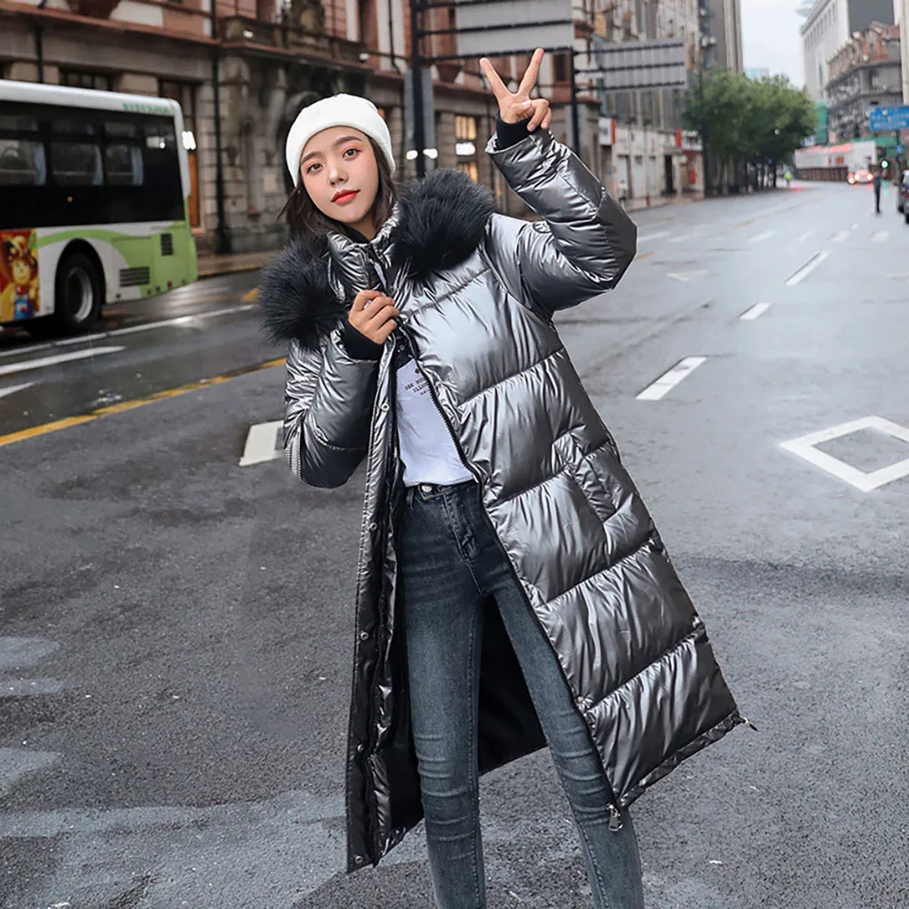 Женское зимнее толстое теплое свободное ветрозащитное длинное пальто с яркой поверхностью со стразами