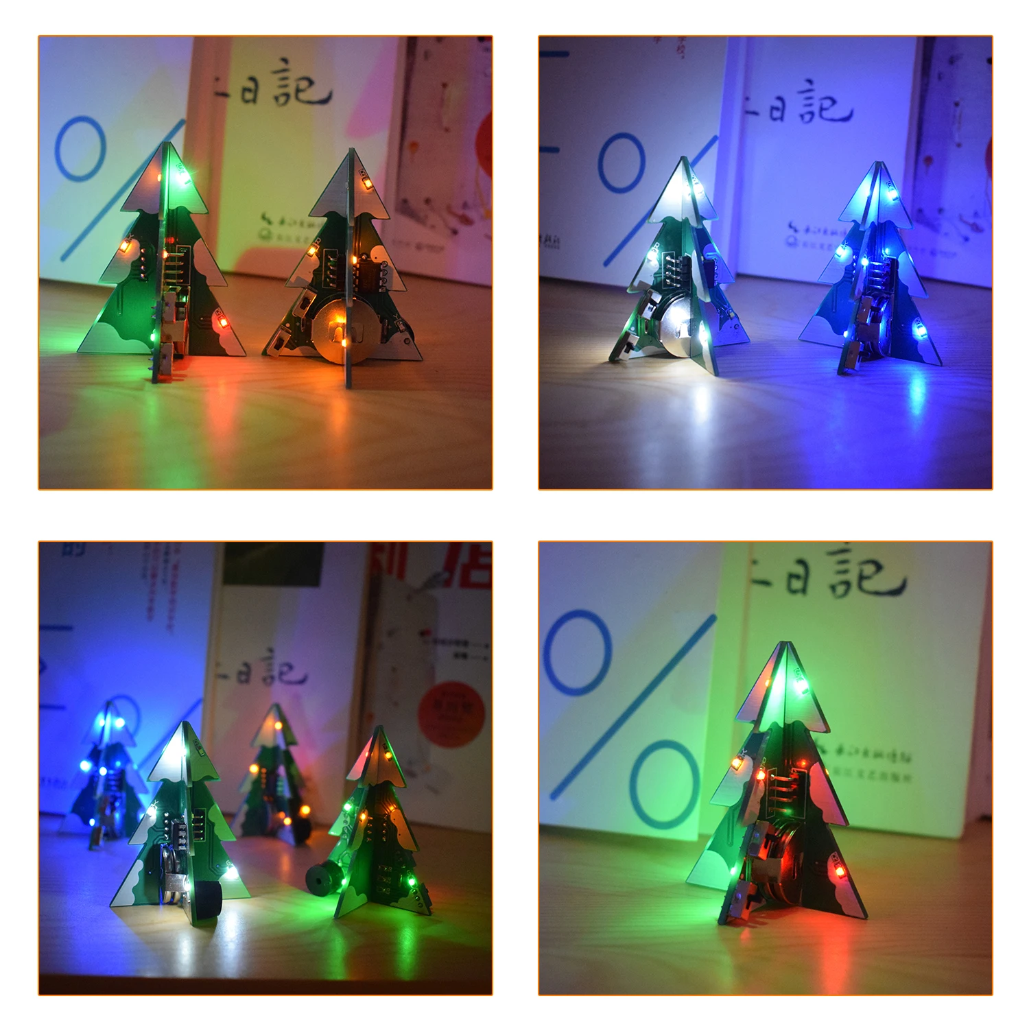 Это простой мини-набор для самостоятельной елки. Три различных печатных плат объединены в 3D стерео модель рождественской елки. Во множестве разных цветов могут быть выбраны. Он может питаться от кнопочного аккумулятора и может быть свободен от источника питания. Встроенный 7 светодиодный градиентный режим плюс 7 различных рождественских мелодий.