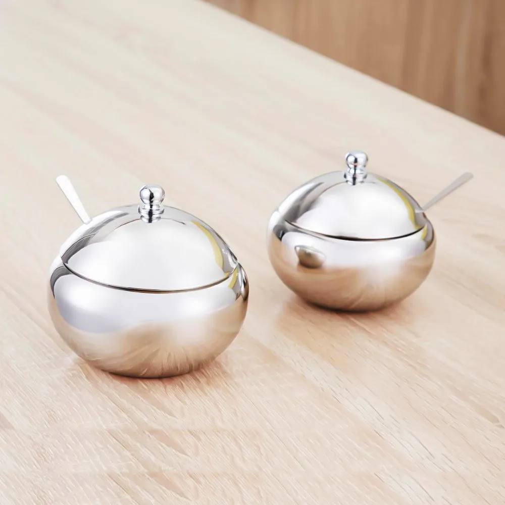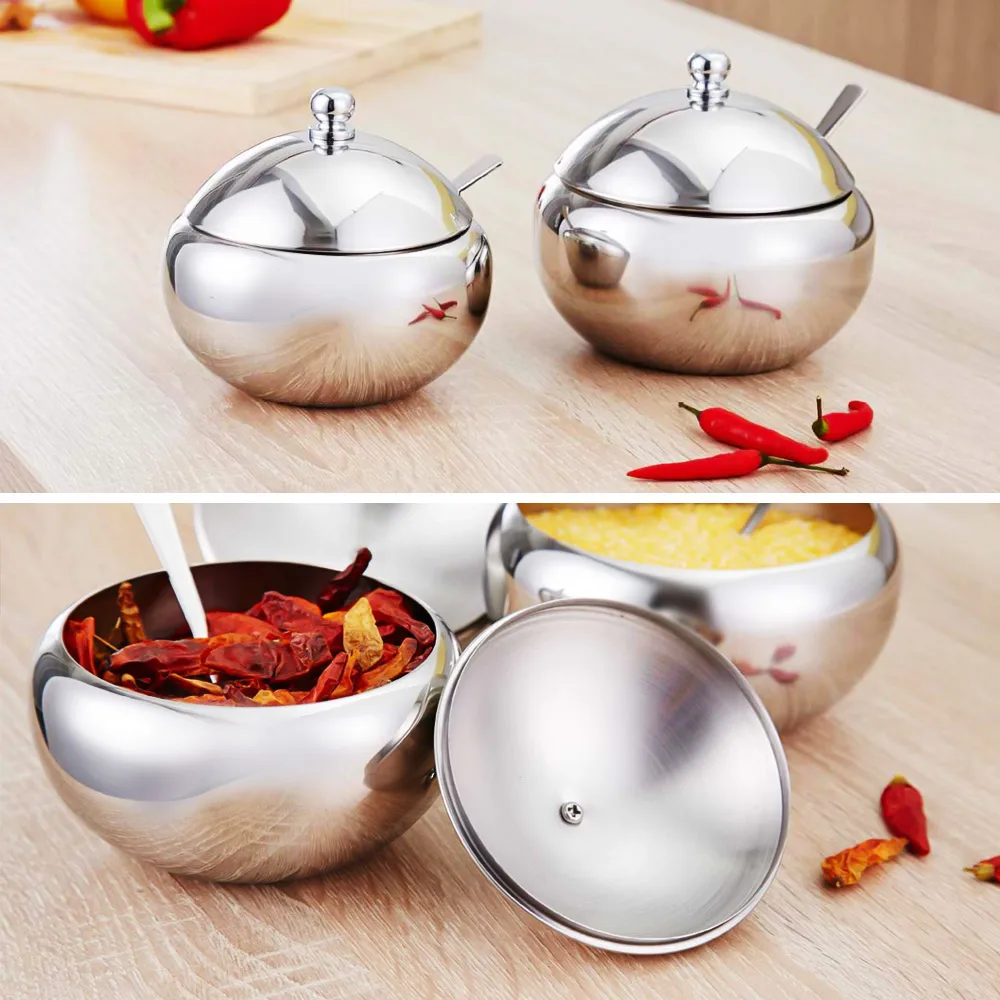 Этот горшок для приправ из нержавеющей стали поставляется с сервировочной ложкой и крышкой, которая отлично подходит для вашей кухни.