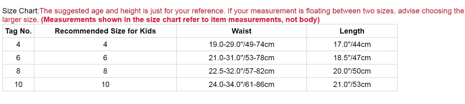 Размер на бирке. Рекомендуется Размеры для детей Обхват талии Длина 4 4 19,0-29,0 "/49-74 см 17,0 "/44 см 6 6 21,0-31,0 "/53-78 см 18,5 "/47 см 8 8 22,5-32,0 "/57-82 см 20,0 "/50 см 10 10 24,0-34,0 "/61-86 см 21,0 "/53 см Полезные советы: Замеры делаются вручную, поэтому учитывайте небольшие погрешности. Цвет на фото может немного отличаться от реального товара из-за особенностей цветопередачи различных мониторов.Когда дело касается покупки защитных стёкол для телефонов,то всегда выбираю покупку в интернете с зарубежных магазинов,так как там намного дешевле,чем... Читать отзыв полностью...