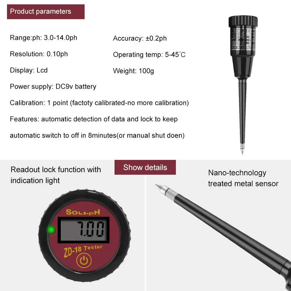 Особенности: 1. Используйте специальные магнитные стали в качестве головки, чтобы обеспечить время измерения. Колесо фиксированный Li0 2. Материал зонда czeto, чтобы обеспечить точность измерений и погрешность В течение длительного времени. 3. Простота в использовании, без аккумулятора, без калибровки пользователя. 4. Национальный патент, настоящая гарантия продукта. 5. Для быстрой и простой проверки рН почвы, фруктов, мяса, сыра и других полутвердых материалов.