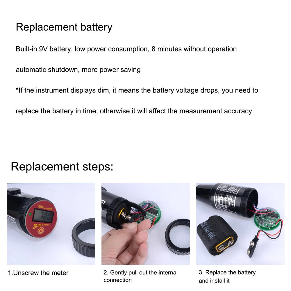 Интеллигентая (ый) цифровой дисплей ZD-18 технические параметры Диапазон измерения: 3,0-14.0PH Точность измерения: положительный и отрицательный 0.2pH (3,0-12.0pH) Калибровка: Калибровка одной точки (на заводе нет другой, калибровка) Характеристики: автоматическое обнаружение данных, блокировка и удержание Функция: Автоматическое отключение за 8 минут (или ручное отключение) Объем: 3-8ph; Диапазон влажности: 10%-80% Температура окружающей среды: 5-50 градусов по Цельсию Вес: 100 г Разрешение: 0,1 pH Рабочая температура: 5-45 с Питание: 9 в пост. Тока, аккумулятор (не входит в комплект) Размер: 50. 5*250 миллиметр Рекомендуемая Глубина: 65 milimeter