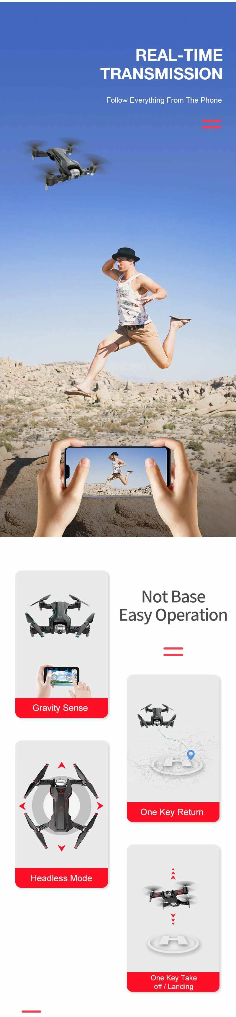 Функция:Вверх/вниз, вперед/назад, поворот влево/вправо, боковой полет,Gps позиционирования, Безголовый режим, следуйте за мной, окружающие полеты, полеты в Waypoint, режим удержания высоты, Wi-Fi FPV, настройка уровня, Взлет/посадка одной кнопкой, управление руками, съемка жестов, видео жестов, мВ, картинка в картинке, переключение двойной камеры, сплит-экран, оптическое распределие позиционирования.