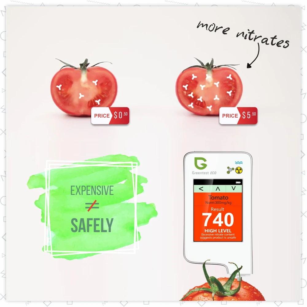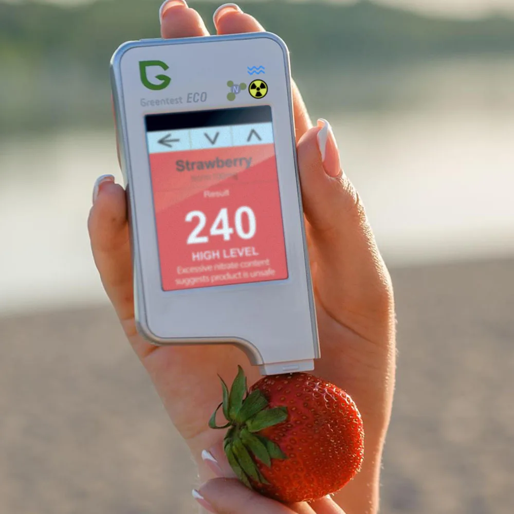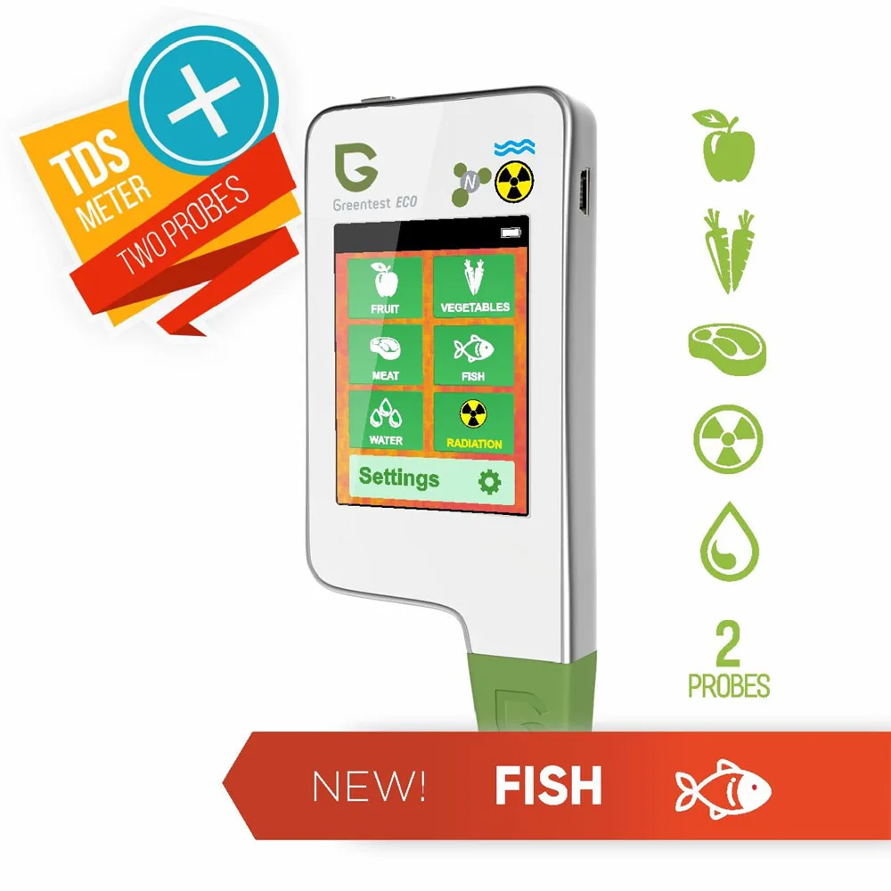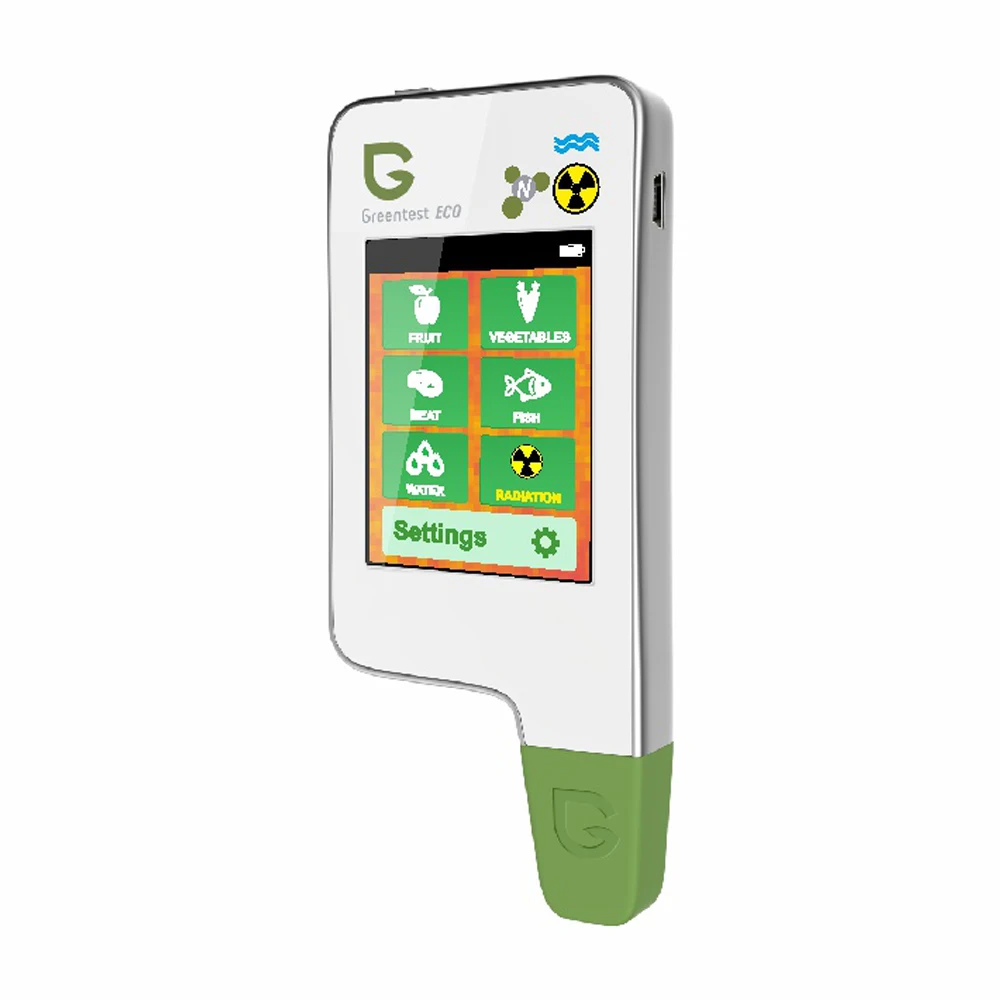 Greentest ECO-5F представляет собой 3-в-1 нитрат, жесткостиь воды и радиации устройство для тестирования. Разработано с использованием новейшей технологии тестирования нитратов, воды и радиации, инновационный ECO-5F обнаруживает уровень нитрата в 64 из наиболее часто потребляемых фруктов и овощей, а также всех видов мяса и рыбы. Кроме того, greenest ECO-5F обнаруживает общее содержание растворенных твердых веществ в воде (или твердость воды), а также фоновое излучение в вашей окружающей среде предупреждает вас о небезопасном облучении. Его особая функция быстрого анализа может сказать вам всего за 3 секунды, если ваша еда, вода или окружающая среда вредны для вашего фитнеса.