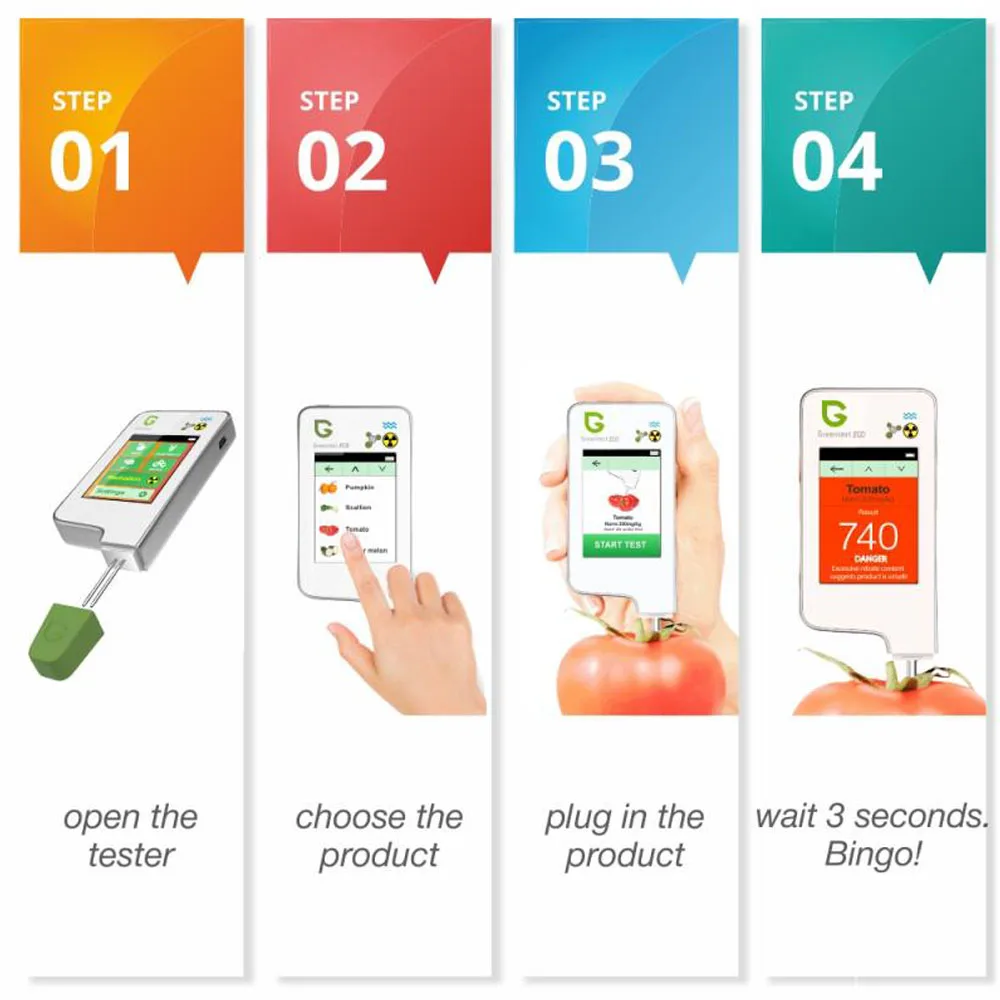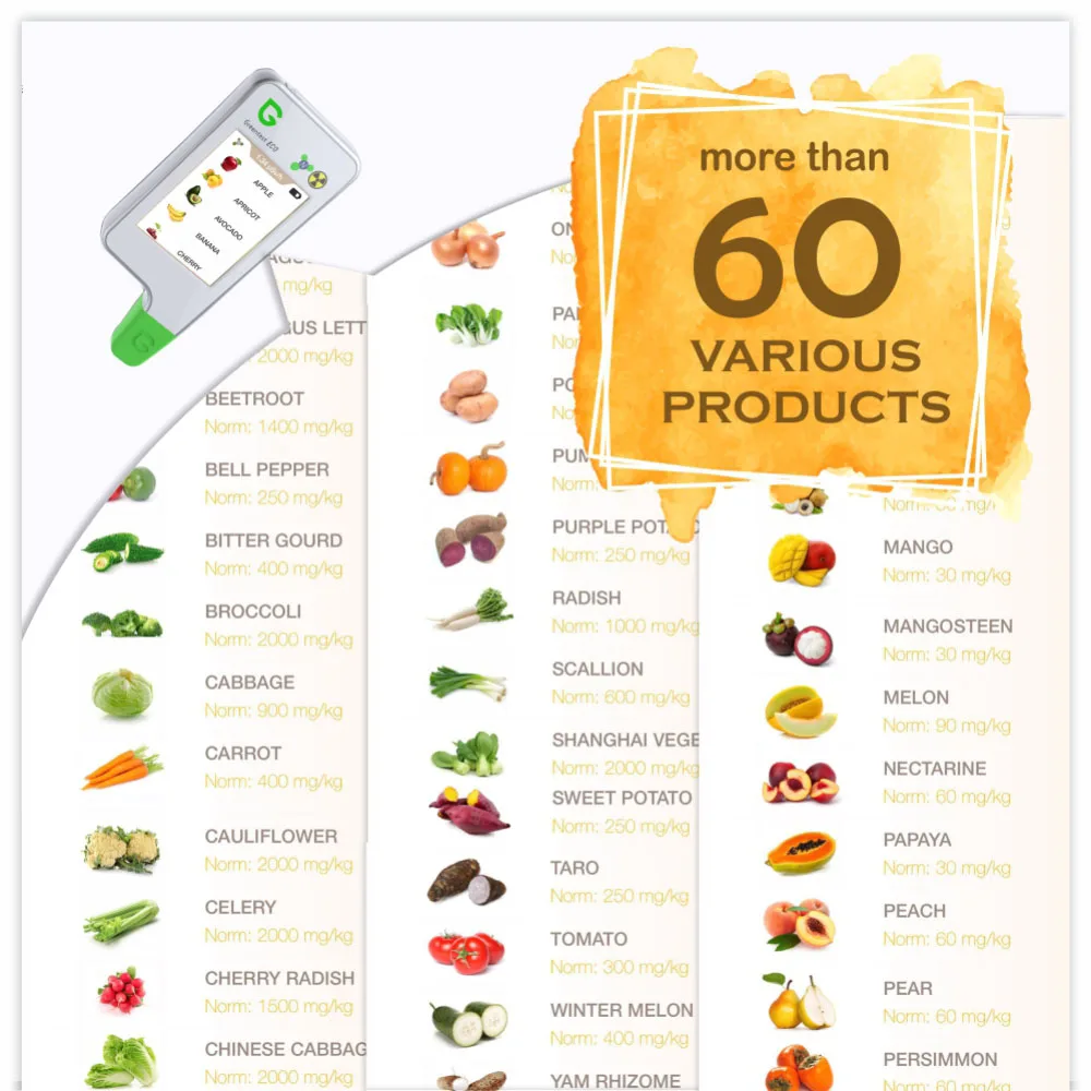Простой в использовании интерфейс: зеленый цветной дисплей с высоким разрешением ECO-5F обеспечивает простой в использовании интерфейс. Это особое и интуитивное программное обеспечение для тестирования нитрата и излучения позволяет быстро просматривать качество и безопасность Ваших фруктов, овощей, мяса, воды и окружающей среды.