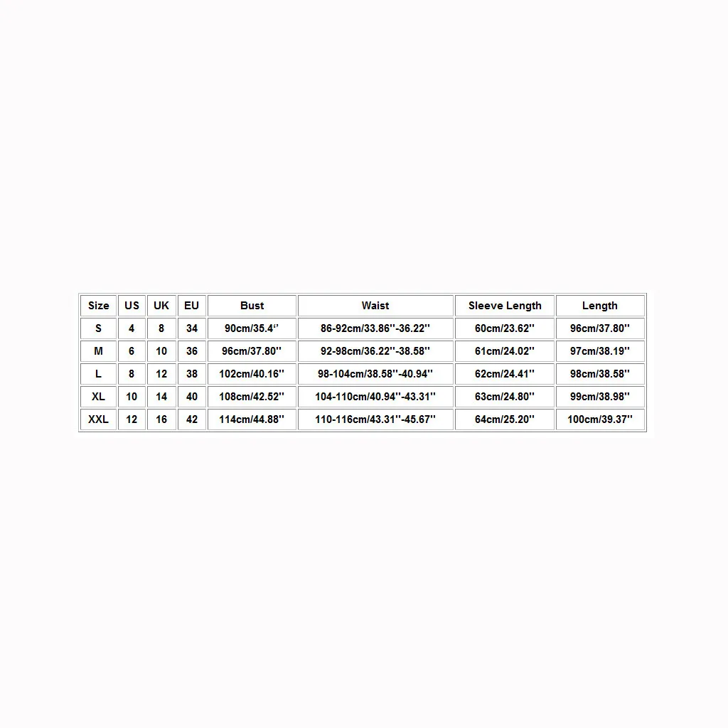 Пожалуйста, сравните размеры детали с вашими перед покупкой! Цвета могут немного отличаться в зависимости от настроек компьютера и монитора Пожалуйста, учитывайте разницу в 1-3 см из-за ручного измерения, спасибо (все измерения в см и обратите внимание, что 1 см = 0,39 дюйма)Размер Свяжитесь с нами Великобритания ЕС Обхват груди Обхват талии Рукав Длина Длина S 4 8 34 90 см/35,4'' 86-92 см/33,86 ''-36,22'' 60 см/23,62'' 96 см/37,80'' М 6 10 36 96 см/37,80'' 92-98 см/36,22 ''-38,58'' 61 см/24,02'' 97 см/38,19'' L 8 12 38 102 см/40,16'' 98-104 см/38,58 ''-40,94'' 62 см/24,41'' 98 см/38,58'' XL 10 14 40 108 см/42,52'' 104-110 см/40,94 ''-43,31'' 63 см/24,80'' 99 см/38,98'' XXL 12 16 42 114 см/44,88'' 110-116 см/43,31 ''-45,67'' Высота голенища 64 см; 25,20'' 100 см/39,37''