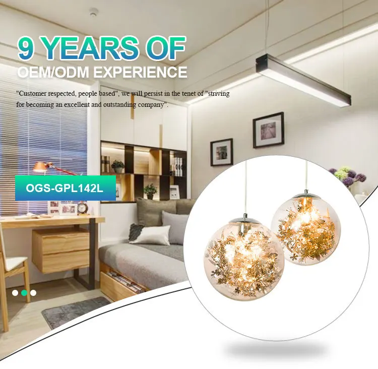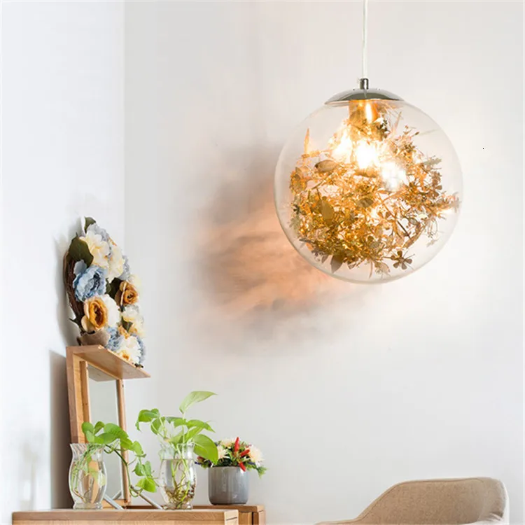 Pendant lamp Material Glass Color Clear glass + gold/silver/black metal flower Size D250mm Style vintage/industrial/simple/modern Warranty 3 years MOQ 5pcs Voltage 110V~240V Customized OEM/ODM Packing Export Brown Carton